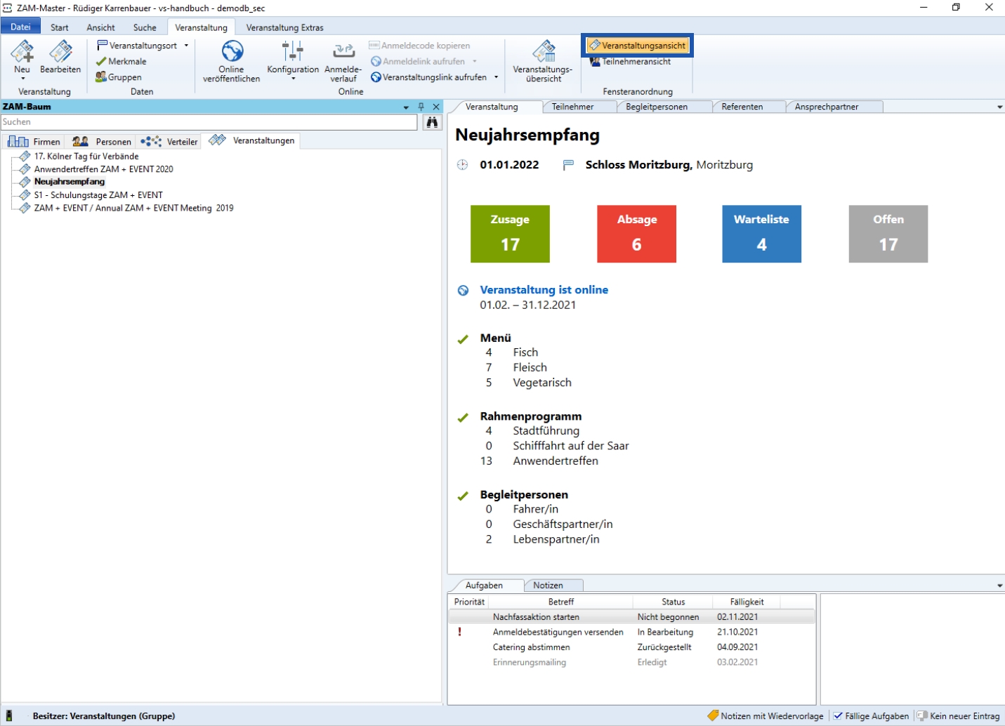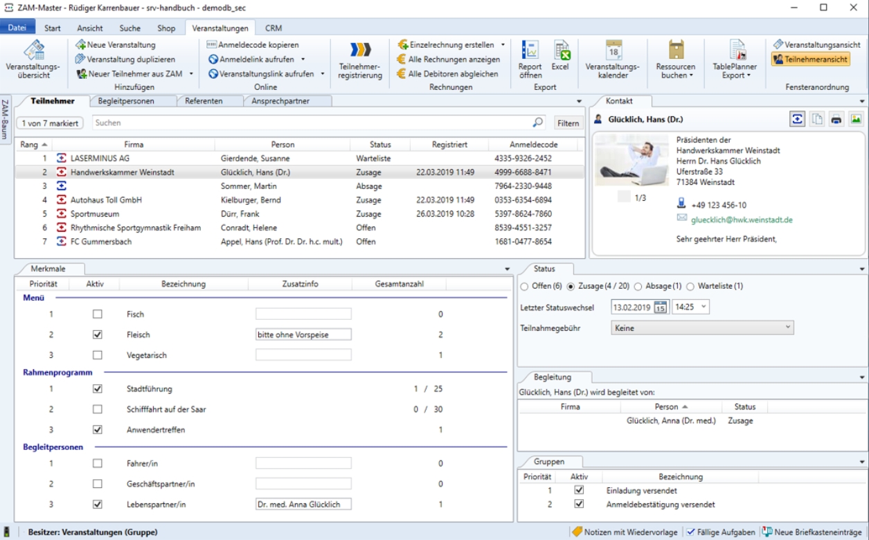 EVENT - Seminar- und Veranstaltungsmanagement unterstützt Sie bei der professionellen Organisation, Verwaltung und Durchführung von Veranstaltungen aller Art wie bspw. Seminaren, Trainings, Schulungen, Messen, Konferenzen, Tagungen, Arbeitskreissitzungen, Fortbildungen und anderen Events. Natürlich ist neben Präsenz-Veranstaltungen auch die Abwicklung virtueller oder Hybrid-Veranstaltungen möglich, unter Einsatz des Videokonferenz-Tools Ihrer Wahl.