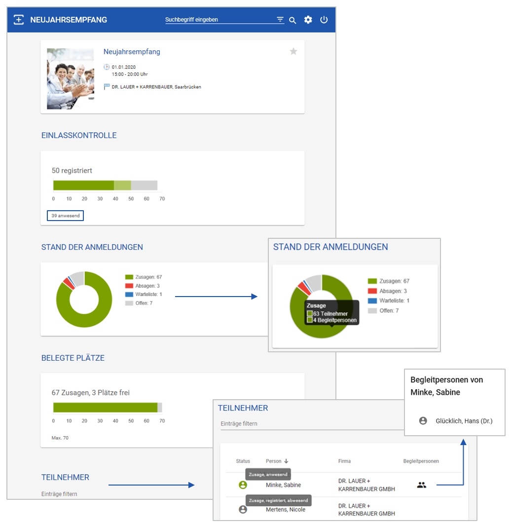 Ein umfassendes Einladungs- und Teilnehmermanagement, Aufgabenplanung und Budgetkontrolle sind bereits enthalten. Außerdem komplettieren die Online-Anmeldung zur Veröffentlichung von Veranstaltungen und Zugangskontrolle via QR-Code zur automatisierten Einlasskontrolle die Lösung. Dank der zentralen Steuerung sämtlicher Informationen auf einer gemeinsamen Plattform können Sie sich ganz auf Ihre Veranstaltungsteilnehmer konzentrieren.