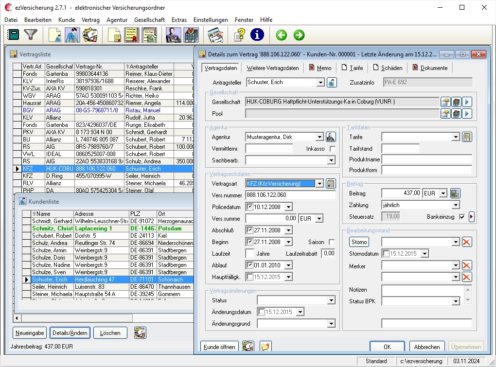 Mit ezVersicherung verwalten Sie beliebig viele Versicherungsverträge. Die innovative Softwarelösung ist für alle Arten von Kfz-, Sach-, Lebens- und Krankenversicherungen sowie Fonds und andere Geldanlagen konzipiert. Zahlreiche Word-Dokumentvorlagen für Kurzbriefe, Schadenanzeigen, Kündigungen, Beitragsfreistellung, etc. stehen Ihnen zur Verfügung. Die Software ist für alle Arten von Kfz-, Sach-, Lebens- und Krankenversicherungen sowie Fonds und andere Geldanlagen geeignet.