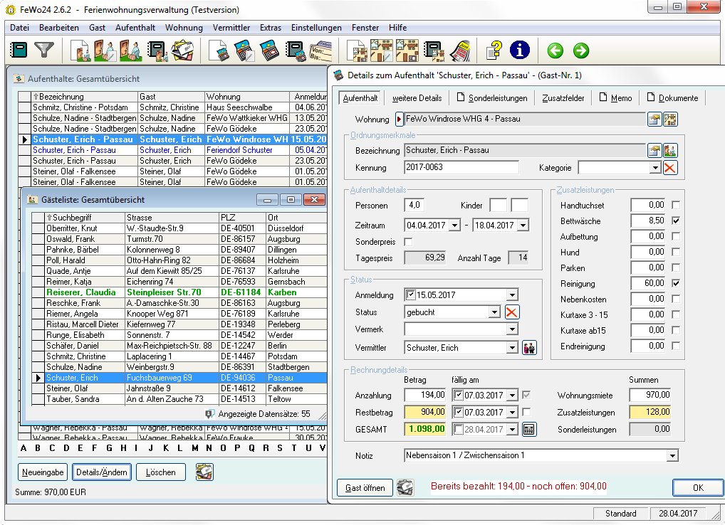 Die Ferienwohnungsverwaltung FeWo24 2.6 unterstützt Sie wirkungsvoll bei der täglichen Arbeit mit Ihren Gästen und Reservierungen.
