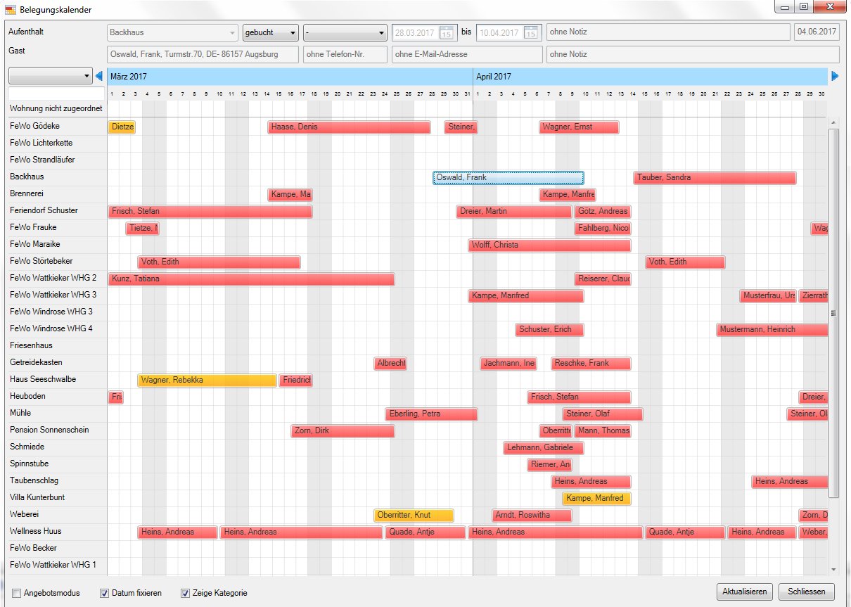 Mit FeWo24 managen Sie effizient und sehr komfortabel Gäste und Termine, Aufenthalte und Wohnungen. Die Softwarelösung umfasst u.a. einen interaktiven Belegungskalender, mit dem Sie alle Belegungen in einem Endlos-Kalender anzeigen können. Diese können direkt geändert, verschoben und neue Belegungen hinzugefügt werden.