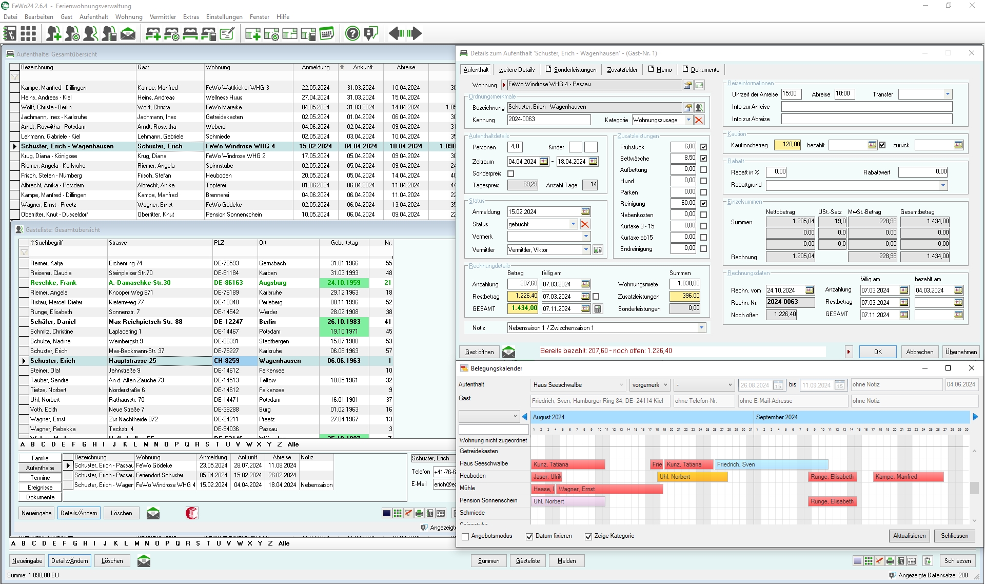 FeWo24 ist eine leistungsstarke Verwaltungssoftware mit intuitiv bedienbarer Benutzeroberfläche für Ferienwohnungen (auch Appartements, Pensionen, Zimmer, kleine Hotels,...). Bereits mit der Basisversion von FeWo24 verwalten Sie effizient Gäste, Aufenthalte, Vermittler und alle Arten von Wohnungen oder Zimmern. Die Software bildet auch Buchungsbestätigungen, Rechnungen, Mahnungen und Belegungsplänen ab.