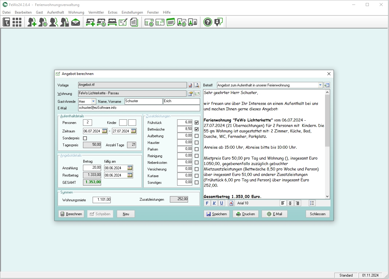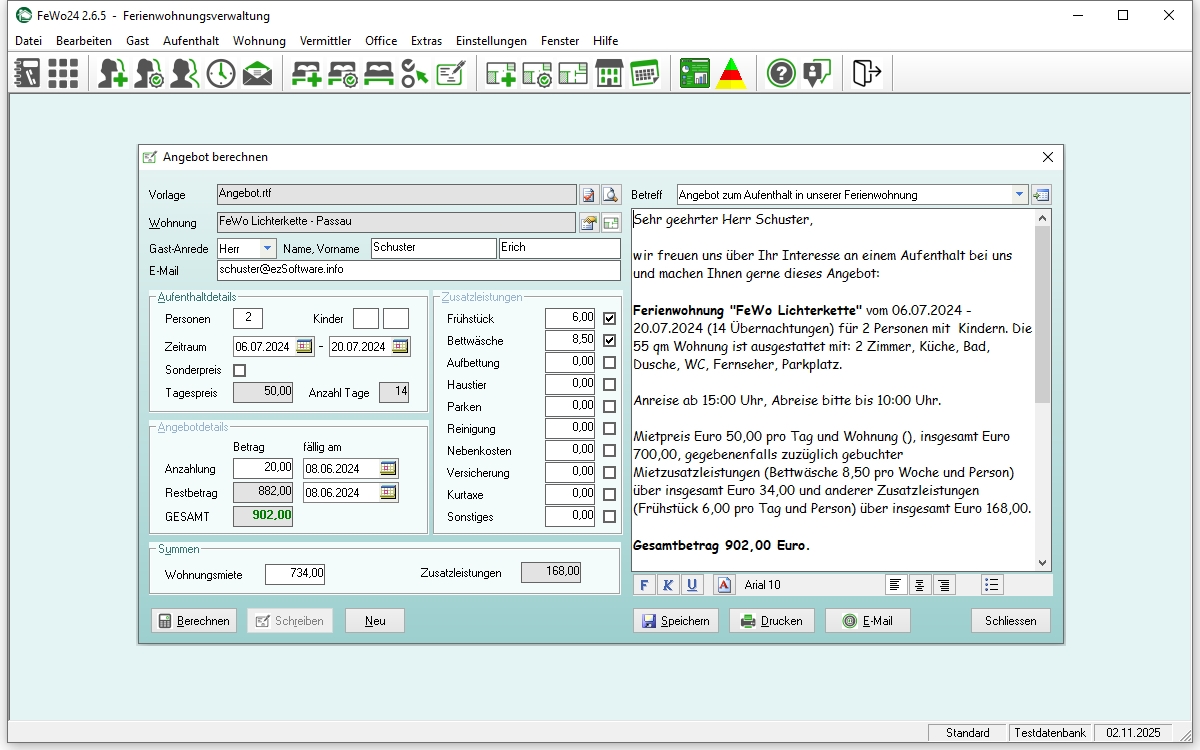 Die integrierte Vorlagenverwaltung mit zahlreichen Templates ergänzt die umfangreiche Korrespondenz-Funktion für Einzel- und Seriendokumente (Word, RTF, Excel, E-Mail, pdf und Berichte). Die Software ist insbesondere geeignet für alle Arten von Ferienwohnungen, Appartements und Pensionen!