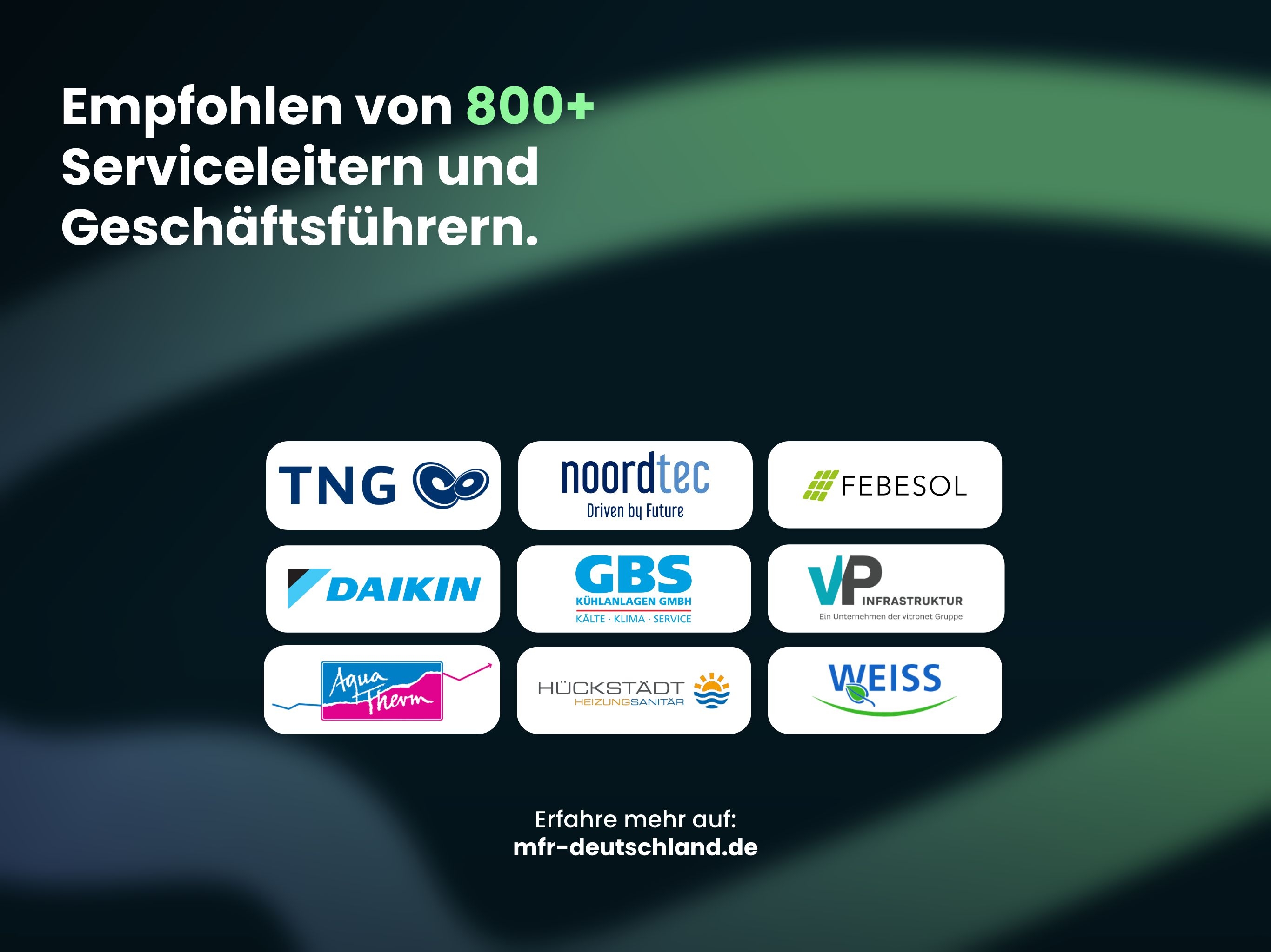 mfr® ist eine cloudbasierte Field-Service-Management-Lösung, mit der Serviceleitungen in mittleren und großen Unternehmen Einsätze im technischen Außendienst durchgängig digital planen, steuern und revisionssicher dokumentieren – von Montage über Instandhaltung und Wartung bis hin zur Reparatur von Anlagen und Geräten.