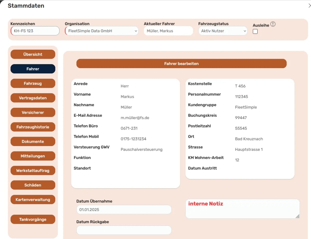 - Fahrer- und Nutzerverwaltung: Zuordnung von Fahrzeugen zu Fahrern, Erfassung von Kostenstellen, Buchungskreisen und Lohnbuchhaltungsdaten sowie komfortable Pflege von Kontaktdaten.