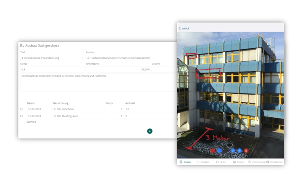 Mit dieser Bürokomplettlösung erstellen Sie Dokumente wie z.B. Abnahmeprotokolle, Arbeitsberichte und Bautagebücher, welche direkt in der App unterschrieben werden können.