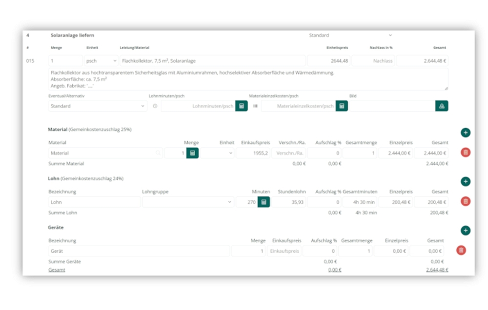 Kalkulieren Sie alle notwendigen Material- und Arbeitskosten für Ihre Angebote. Greifen Sie dabei auf unsere umfangreiche sirAdos Datenbank zurück oder legen Sie Ihre eigenen Artikel und Leistungen an.