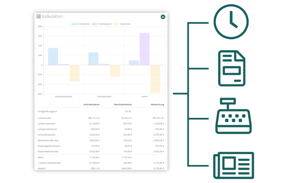 Erfasste Arbeitszeiten und Eingangsrechnungen werden automatisch ausgewertet.