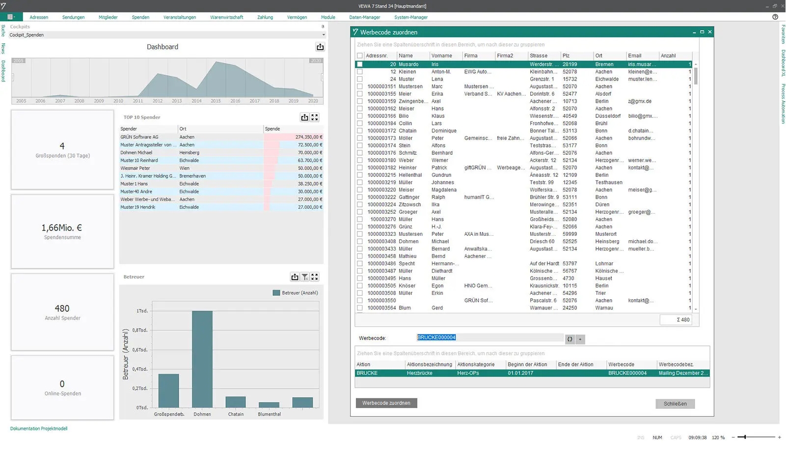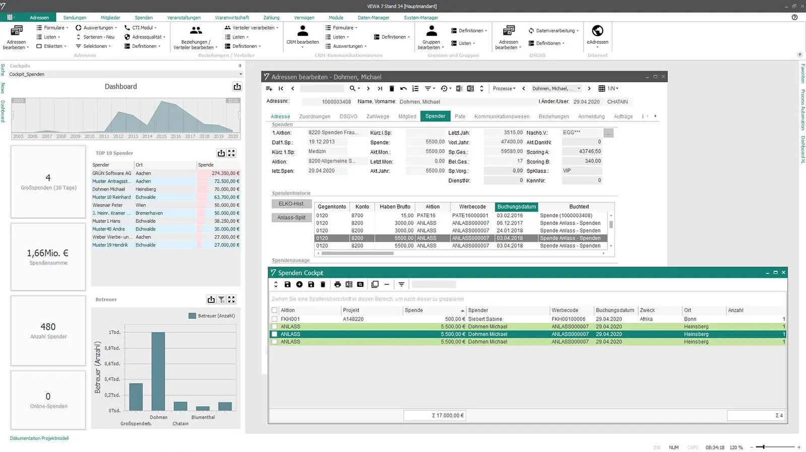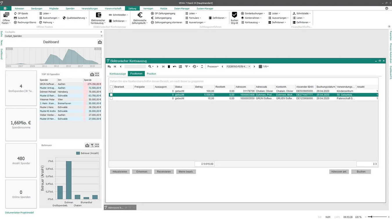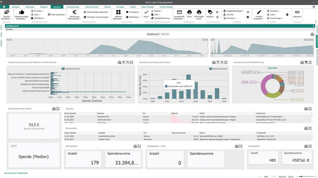 Im Kampagnenmanagement können über Selektionen nach Spenderklassifizierungen, Scoringwerten oder dem Beziehungsmanagement zielgerichtete Ansprachen erfolgen. Die Spenderverwaltung mit freier Adressstruktur und erweiterbarem Online-Spenderportal lässt kaum Wünsche offen. Eingehende Spenden werden neben der Internetspende auch via elektronischem Kontoauszug oder Lastschriftverfahren automatisch verbucht.