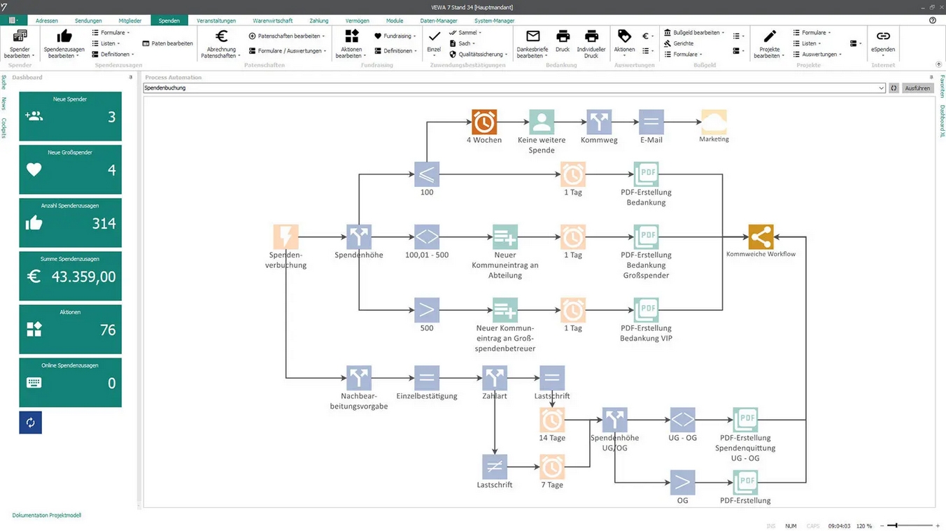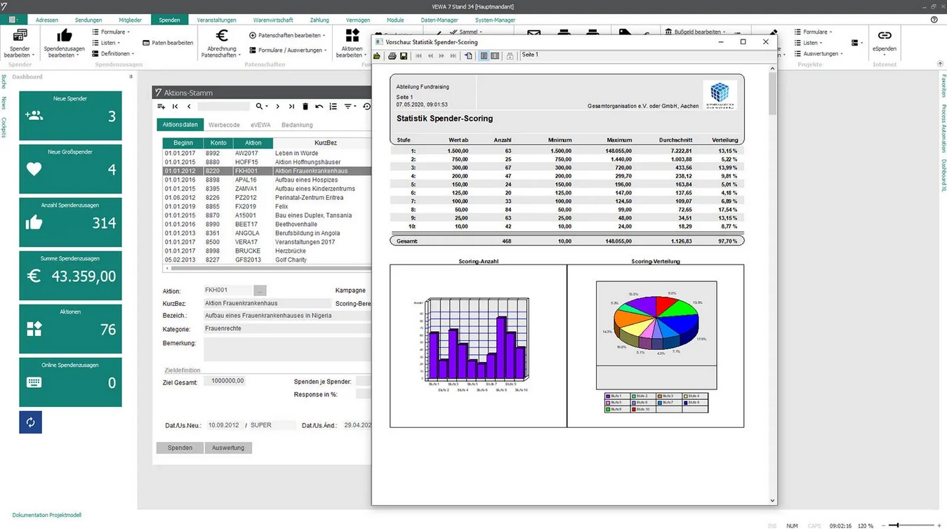 GRÜN VEWA - Spendenverwaltung unterstützt Sie perfekt sowohl bei der Planung als auch bei der Durchführung Ihrer Spendenkampagnen. In einem mehrstufigen Verfahren können Sie Ihre Maßnahmen planen und per Knopfdruck mit dem Empfängerkreis verknüpfen. Zur Ermittlung der potentiellen Spenderpools können Sie das leistungsstarke Selektionswesen von VEWA einsetzen.