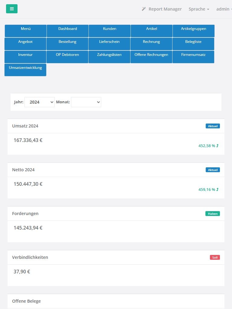 Mit den Dashboards haben Sie alle Geschäftsprozesse im Blick; Umsätze, Lagerbewegungen und Kundengruppen werden grafisch aufbereitet und lassen sich über interaktive Diagramme, Filter und Exportfunktionen auswerten.