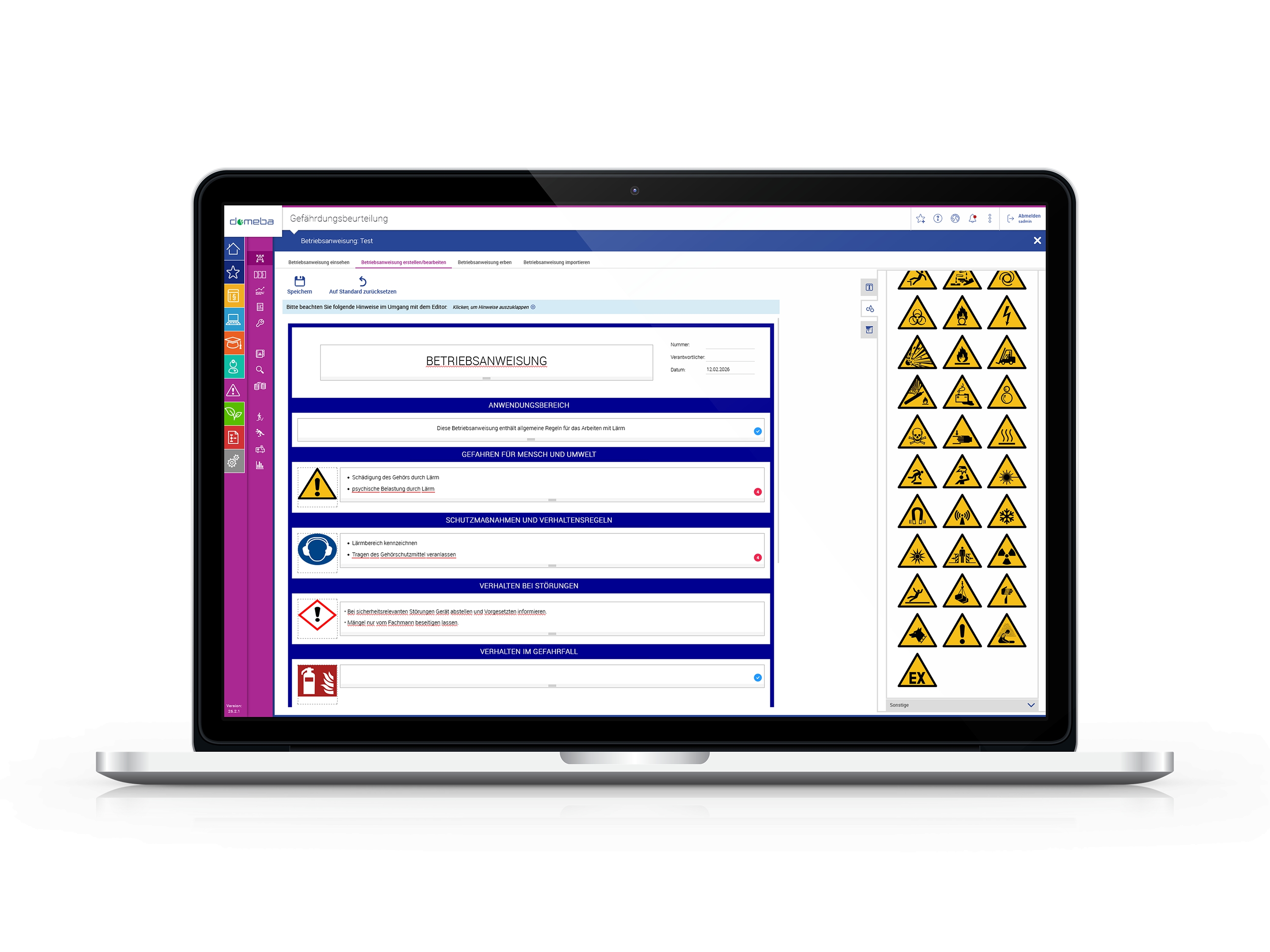 Mit domeba lassen sich sämtliche Bereiche des Arbeits- und Gesundheitsschutzes, der Gefährdungsbeurteilungen, des Vorfallmanagements, der Mitarbeiterschulungen, der arbeitsmedizinischen Vorsorge, der Gefahrstoffverwaltung und des Dokumentenmanagements zentral und benutzerfreundlich abbilden. Die Lösung unterstützt Unternehmen dabei, gesetzliche Anforderungen einzuhalten, Arbeitssicherheit zu gewährleisten und branchenspezifische Standards wie ISO 45001, ISO 14001 oder ISO 9001 zuverlässig umzusetzen.