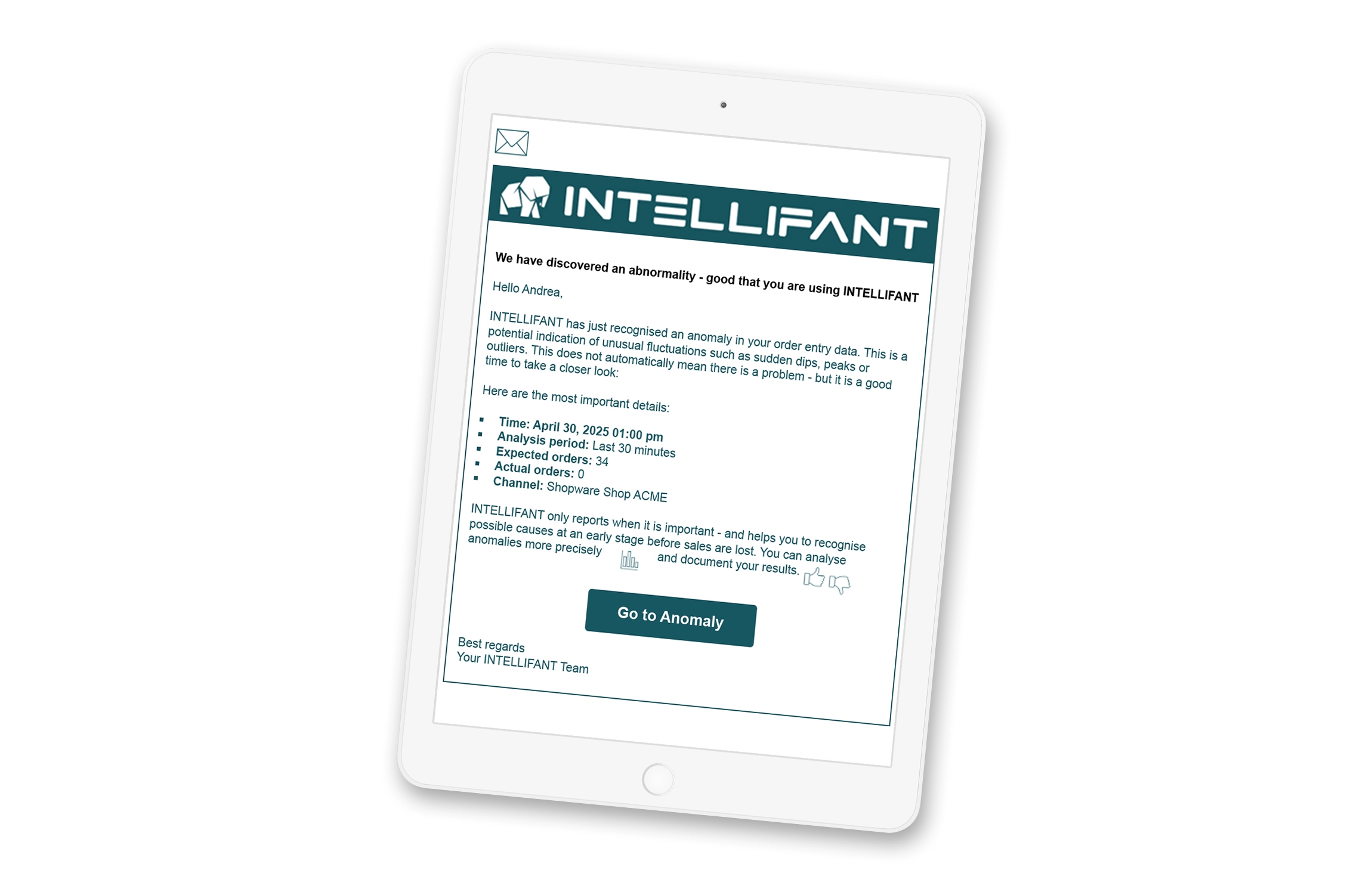 INTELLIFANT ist eine KI-gestützte B2B-SaaS für die proaktive Überwachung des Auftragseingangs im E-Commerce. Die Lösung analysiert kontinuierlich Bestelldaten, erkennt Anomalien (Einbrüche/Spitzen) automatisch und informiert per E-Mail – inklusive Nennung des betroffenen Verkaufskanals.