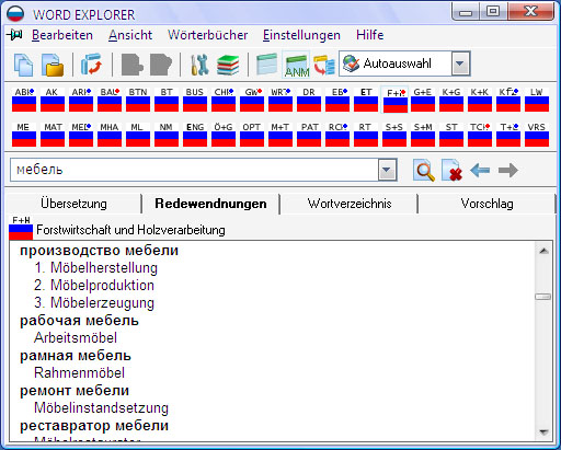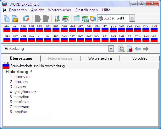 Das Programm Jourist Fachwörterbuch Forstwirtschaft und Holzverarbeitung Russisch-Deutsch, Deutsch-Russisch umfasst ca. 95.000 Wörter und Wendungen aus dem Sektor der Forstwirtschaft und Holzverarbeitung.