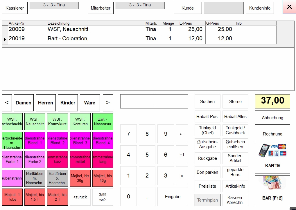- Stammdaten für Kunden, Artikel und Dienstleistungen, Gruppen, Kassierer