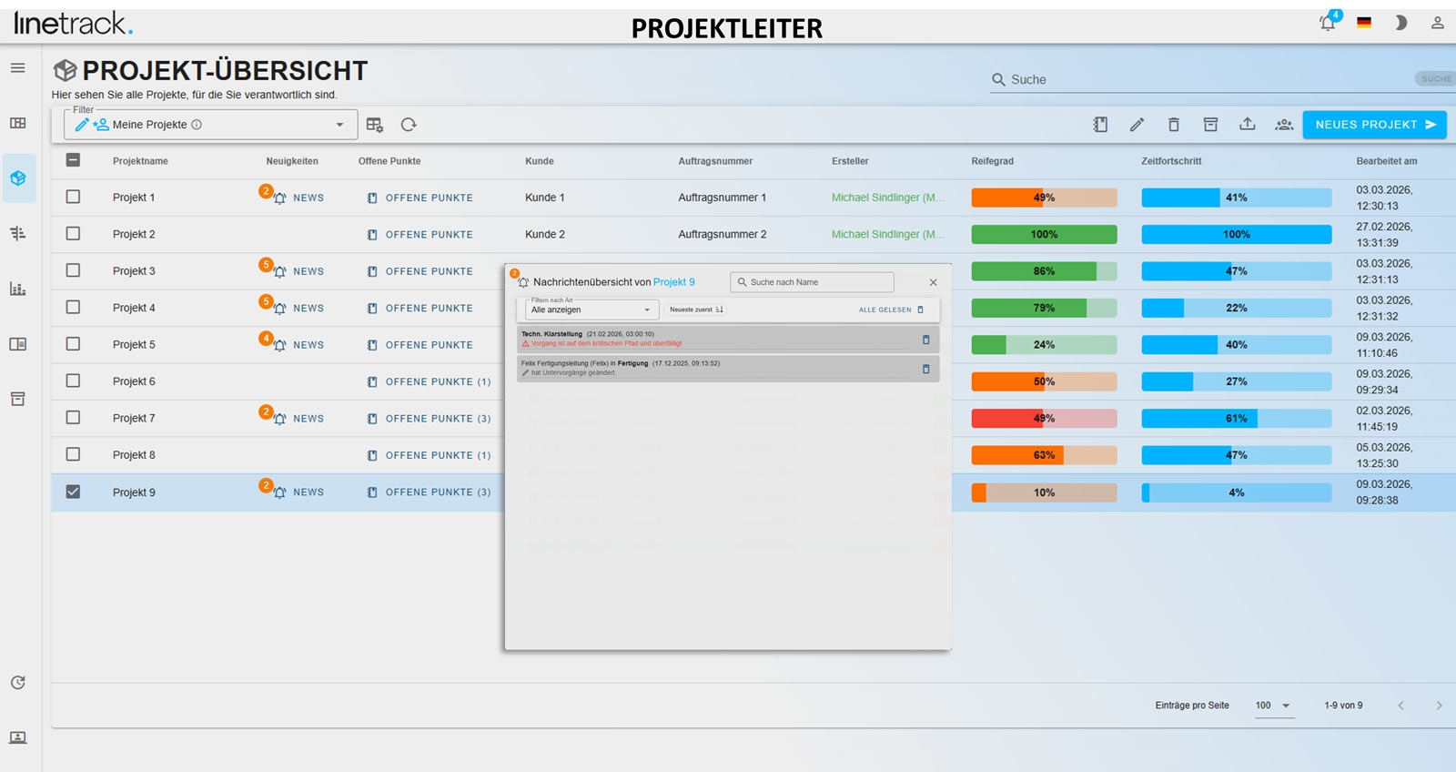 Ja, Linetrack stellt zentrale Projekt- und Portfolioübersichten bereit, damit Sie mehrere Projekte parallel überwachen und priorisieren können.