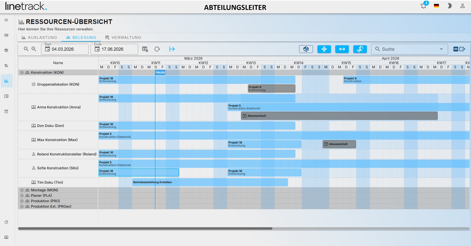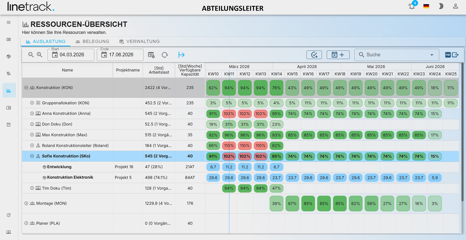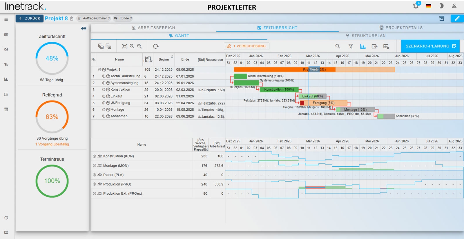 Linetrack verknüpft die Projektplanung mit einer projektübergreifenden Sicht auf Ressourcen und Auslastungen, damit Engpässe früh erkannt und Kapazitäten besser verteilt werden können.
