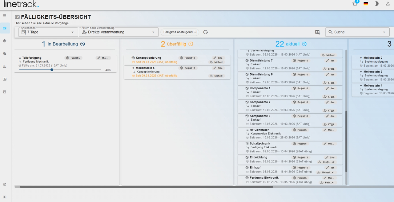 Linetrack ist eine webbasierte Projektmanagement-Software für Industrieunternehmen, die komplexe Projekte zentral planen, bereichsübergreifend steuern und transparent überwachen möchten.