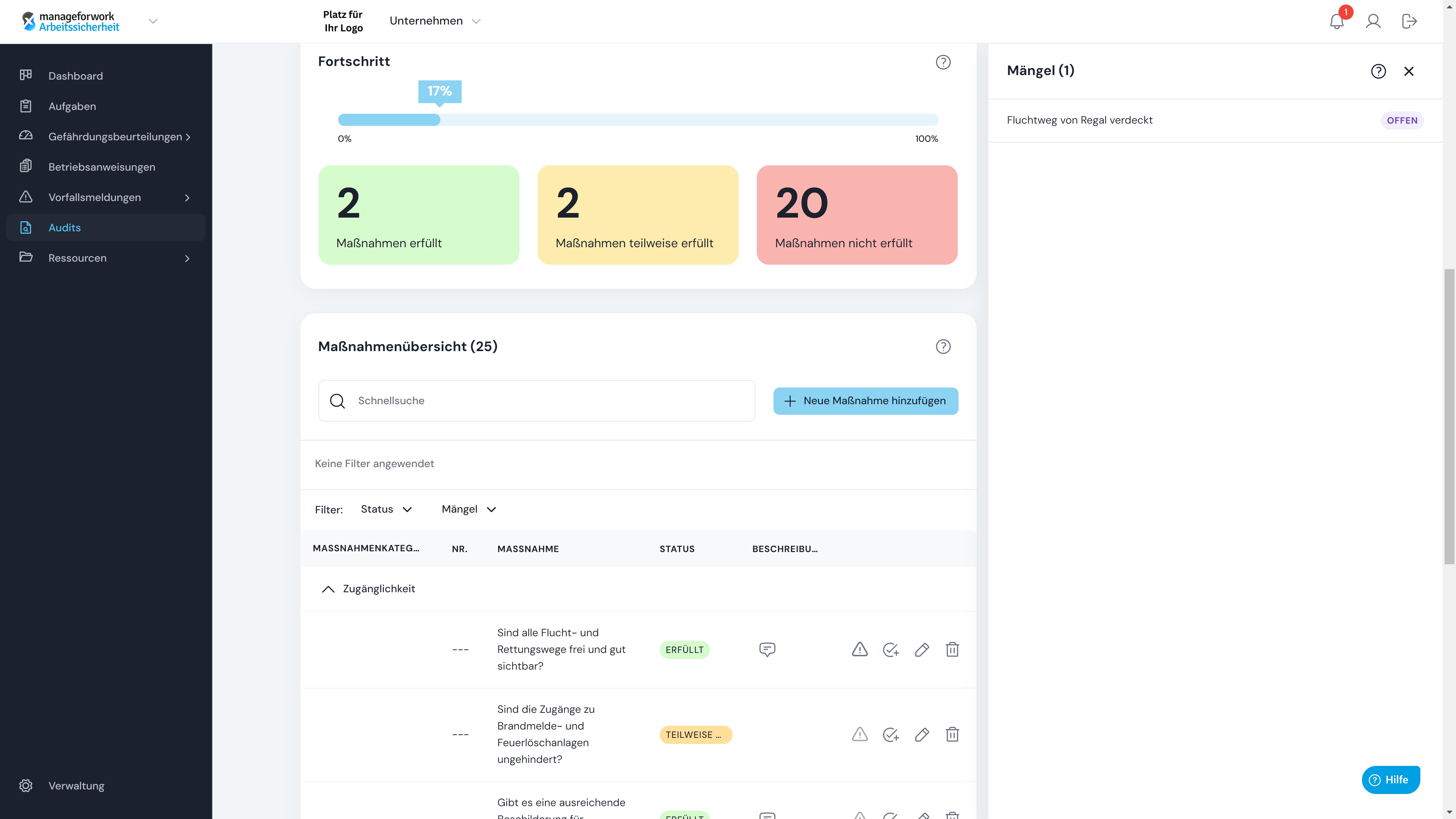 manageforwork ist eine cloudbasierte Compliance-Plattform, die Unternehmen bei der Planung, Umsetzung und Dokumentation gesetzlich vorgeschriebener Managementprozesse unterstützt. Die Software vereint Module für Arbeitsschutz, Betriebsrat, Datenschutz, Informationssicherheit und KI‑Verordnung sowie allgemeine Plattformfunktionen wie Benutzerverwaltung und Aufgabenmanagement. Die mandantenfähige Architektur erleichtert die Verwaltung mehrerer Standorte und ermöglicht eine rechtskonforme Dokumentation aller Prozesse. Durch zentrale Datenhaltung und rollenbasierten Zugriff behalten Sie jederzeit den Überblick über Gefährdungsbeurteilungen, Betriebsratsprotokolle, Verzeichnisse der Verarbeitungstätigkeiten und Risikoanalysen. Sie können Aufgaben delegieren und den Status nachverfolgen sowie Dokumente und Vorlagen effizient verwalten.