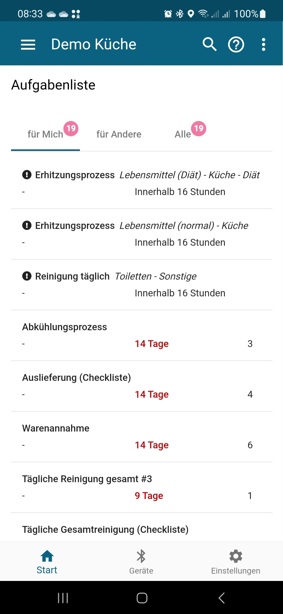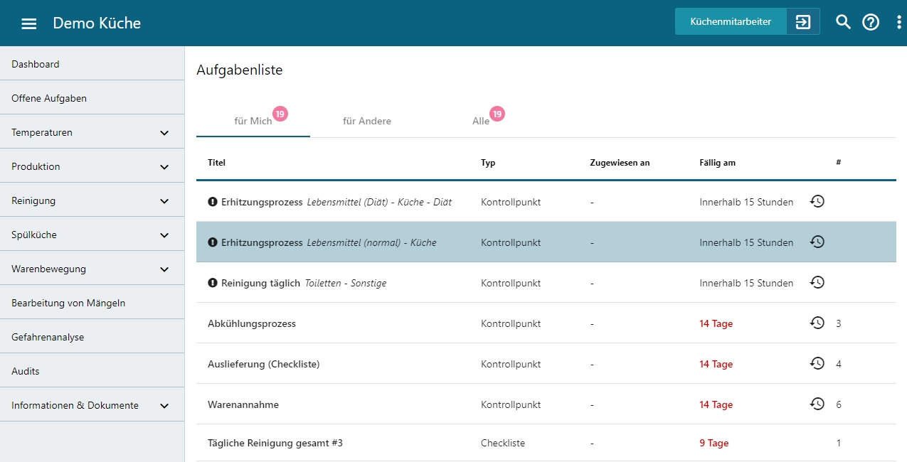 Tägliche Kontrollroutinen sind unerlässlich für dein Küchenteam - dank Matilda endlich digital und mobil! Fehleranfällige handschriftliche Notizen und Aktenordner gehören der Vergangenheit an. Mit einer automatisierten ToDo-Liste behaltet ihr alle anstehenden Aufgaben im Blick - natürlich an eure individuellen Prozesse angepasst. Mit einem Klick markiert ihr Aufgaben als erledigt. So stellt ihr sicher, dass eure Kontrollroutine den aktuellen Verfahren und gesetzlichen Anforderungen entspricht.