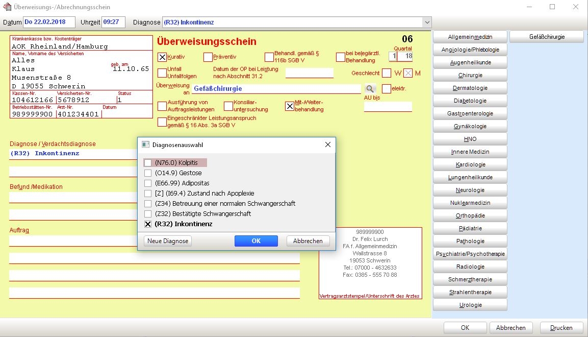 Allgemeinmedizin, Anästhesie, Angiologie, Arbeitsmedizin, BG-/D-Arzt, Chirurgie, Dermatologie, Diabetologie, Endokrinologie, Ergotherapie, Gastroenterologie, Gynäkologie, Hals-Nasen-Ohren-Heilkunde, Heilpraktiker, Internistische Medizin, Kardiologie, Kinder- und Jugendpsychiatrie und -Psychologie, Logopädie, Nephrologie / Dialyse, Neurologie, Notdienst & Bereitschaftsdienst, Notfallmedizin, Nuklearmedizin, Onkologie, Ophthalmologie, Orthopädie, Osteopathie, Pädiatrie, Phlebologie, Physiotherapie, Pneumo- & Pulmologie, Praktische Medizin, Proktologie, Psychiatrie und Psychotherapie, Radiologie, Rheumatologie, Schmerztherapie, Urologie
