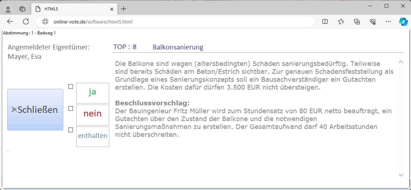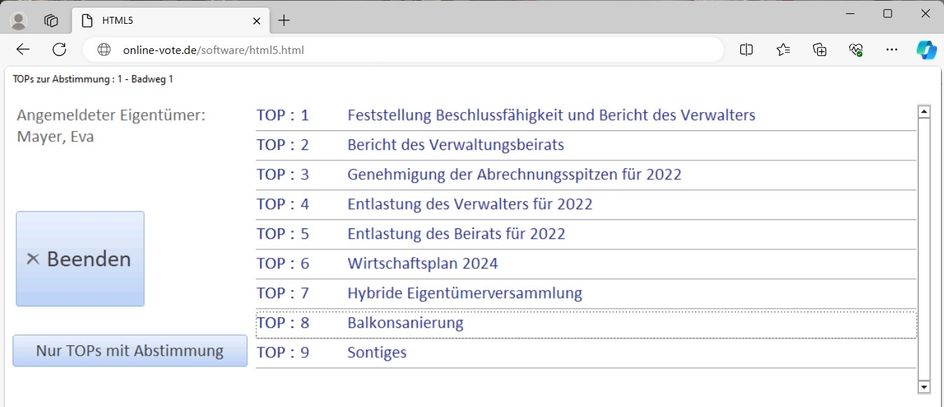 Als Erweiterung zur Haus- und Mietverwaltung (HausWin) ermöglicht das Beschlussfassungsprogramm (Online-Vote) die Versammlungsleitung in Präsenz-, Hybrid- und/oder Online-WEG-Veranstaltungen.