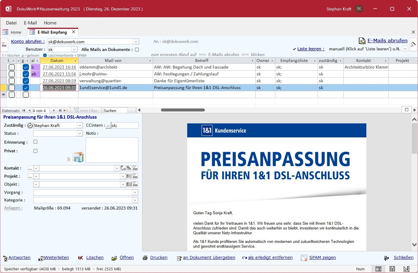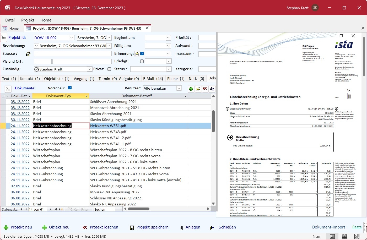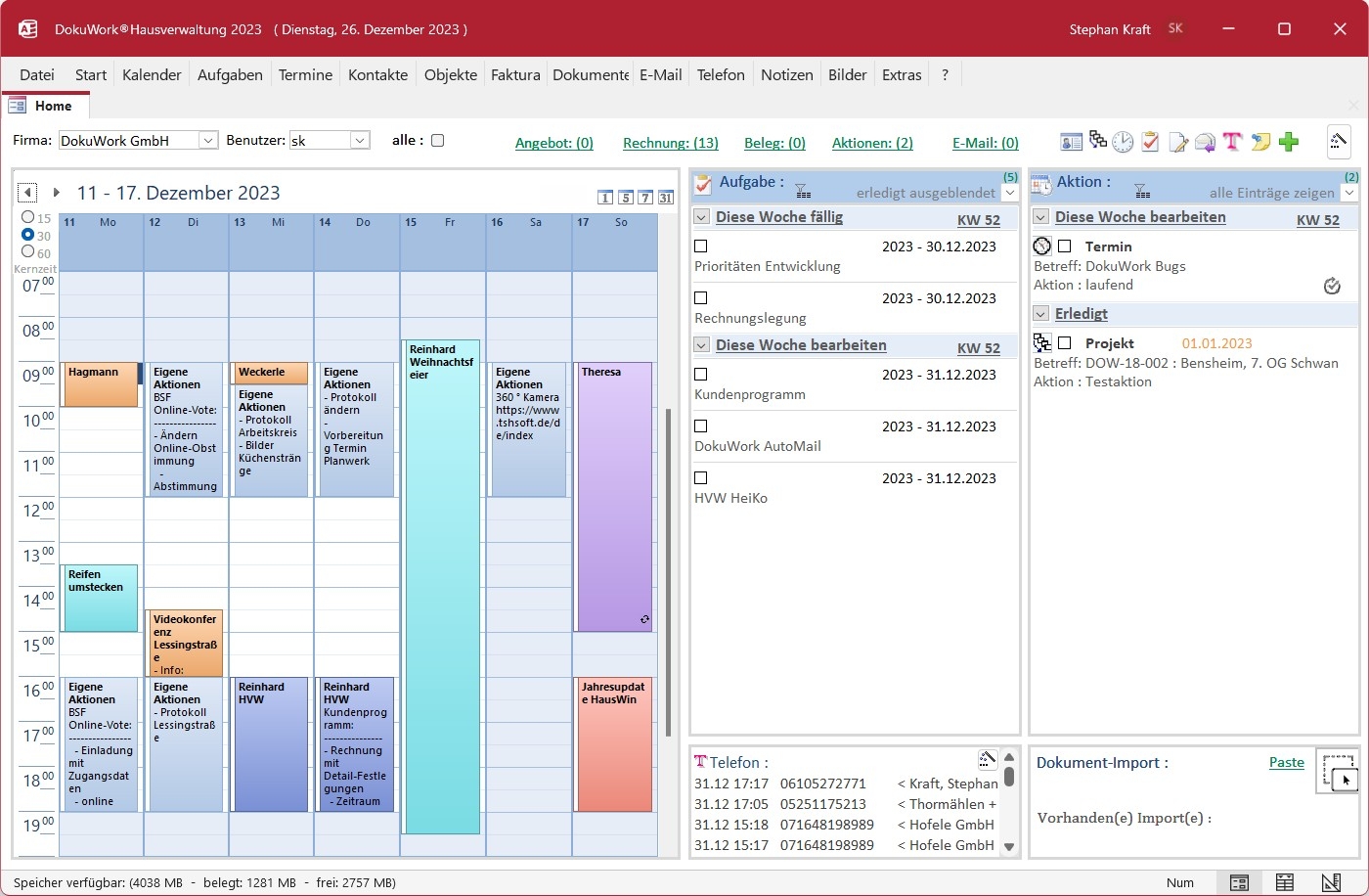 An HausWin und Online-Vote angebunden bietet DokuWork ein kombiniertes CRM und Dokumenten-Management-System mit Workflow, Vorgängen und Fristenüberwachung. Hauptbestandteile sind: