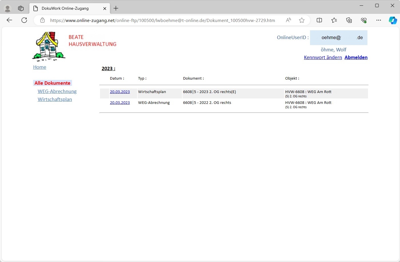 Bietet den zugangsgeschützten Dokumenten-Zugriff für Mieter und Eigentümer. Alle in HausWin, in Online-Vote und in DokuWork erzeugten Dokumente werden automatisch an das Portal übergeben (z.B. Wirtschaftspläne und Abrechnungen, WEG-Einladungen, Beschlüsse und Protokolle, Energieausweise, Teilungserklärungen usw.). Besonderheiten sind: