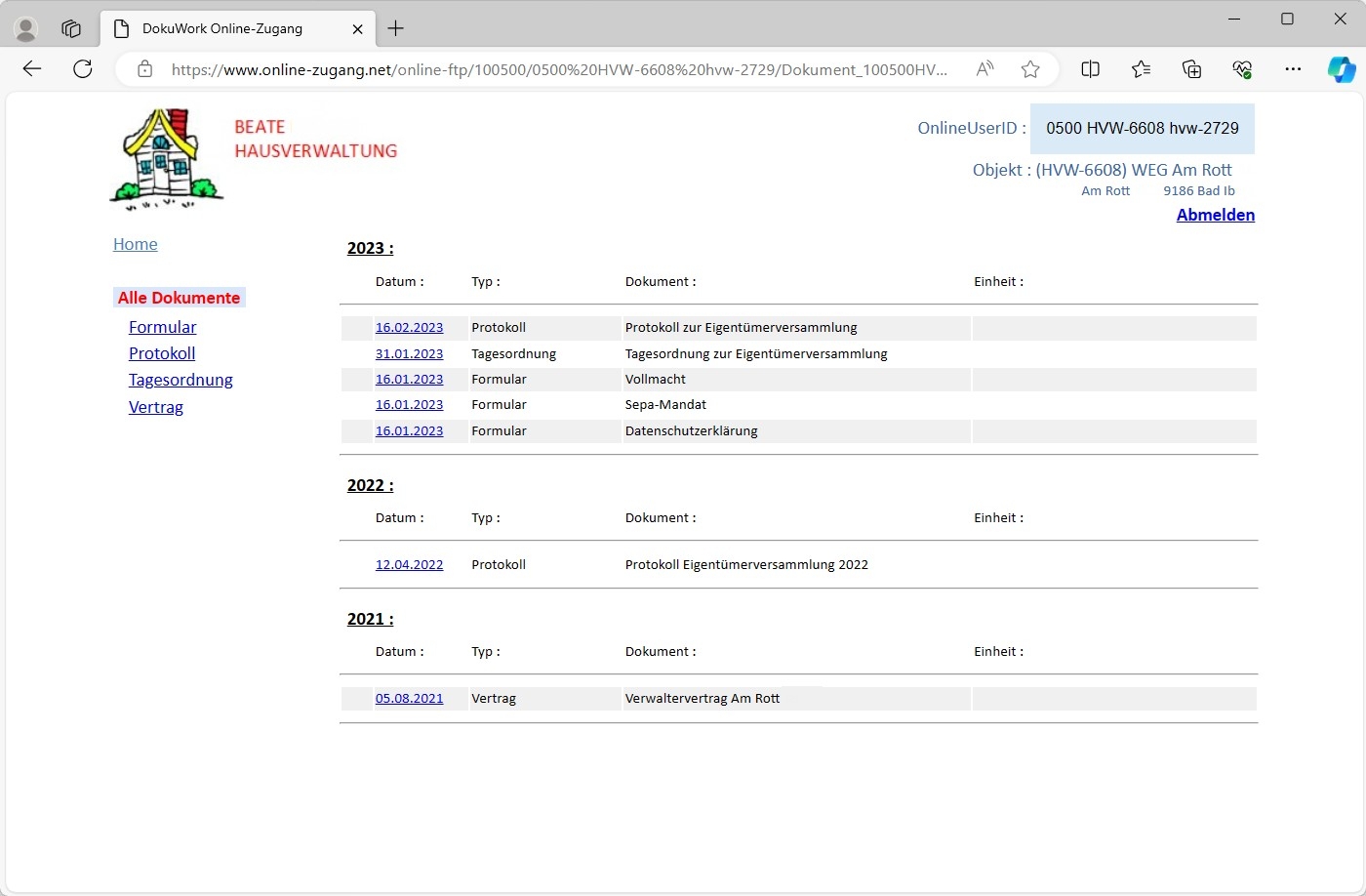 Weiterhin ist ein eigenes Online-Portal lieferbar, an das sich alle Dokumente automatisiert übertragen lassen. Aus der Hausverwaltung (HausWin) sind das WEG- und Mietabrechnungen, Verbrauchsabrechnungen und Wirtschaftspläne, aus der Beschlussfassung (Online-Vote) sind es WEG-Einladungen, Protokolle und Beschlussbücher. Aus dem CRM & Dokumenten-Management (DokuWork) werden alle weiteren Dokumente übergeben. Z.B. Teilungserklärungen, Hausordnungen, Energieausweise, Grundrisse und Angebote oder Rechnungen von Handwerkern.