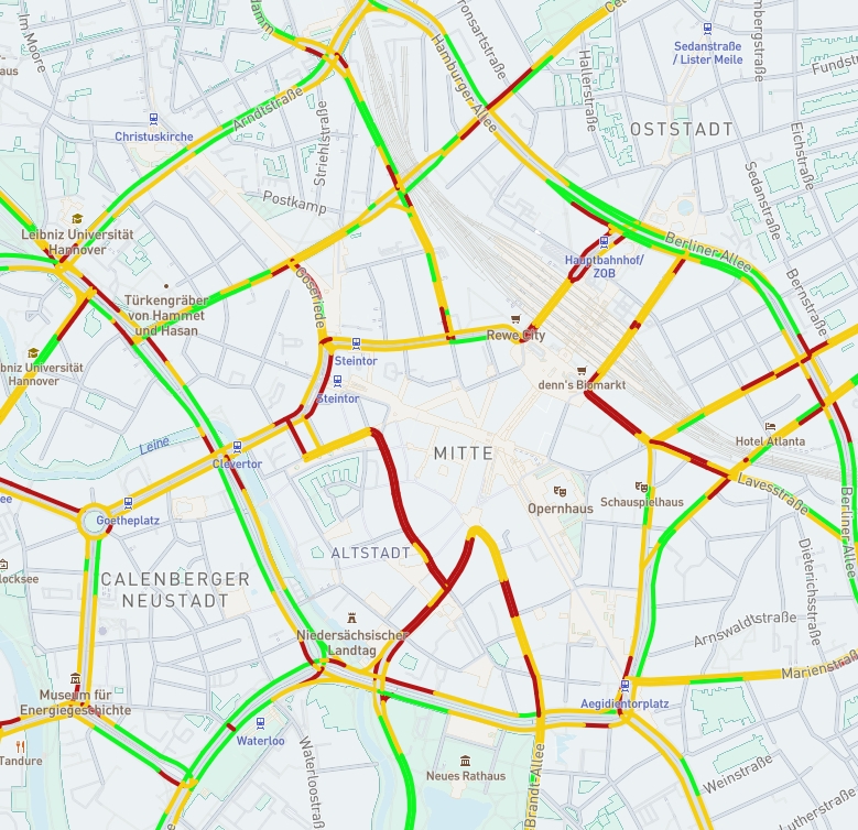 Die Verkehrslage wird alle 15 Sekunden aktualisiert. Dabei verarbeitet die Plattform 1,5 Millionen Verkehrsmessungen pro Minute für eine präzise, prädiktive Navigation.