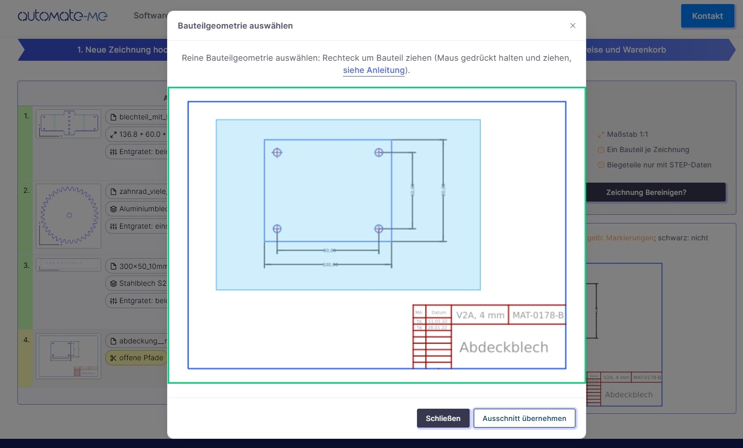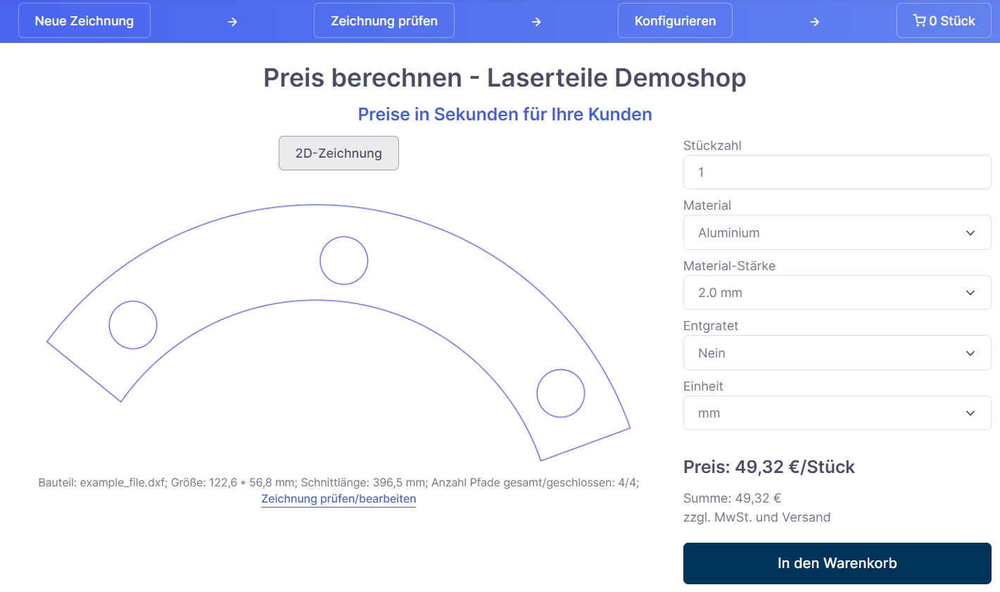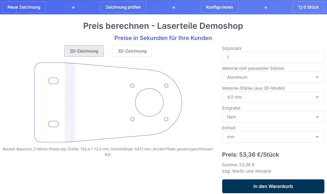 - Preiskalkulation auf Basis der hochgeladenen Zeichnung (DXF, DWG, STEP, STP)