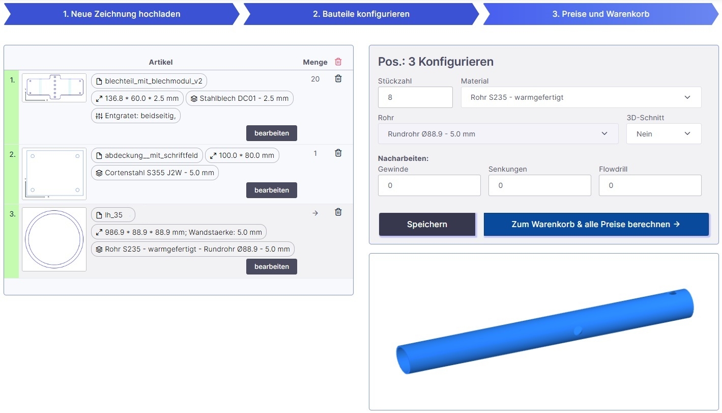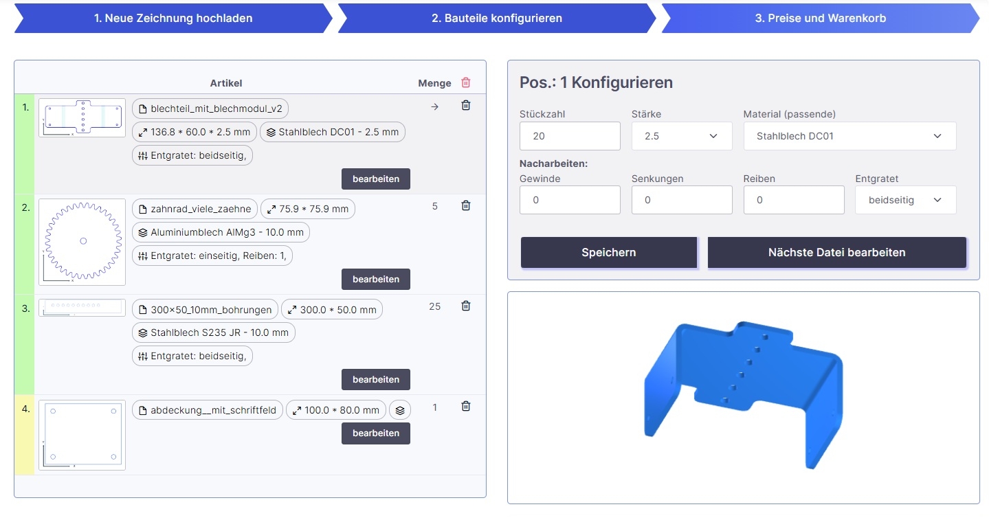 - Bauteil konfigurieren durch Auswahl von Material, Stärke, Menge und Nacharbeiten.