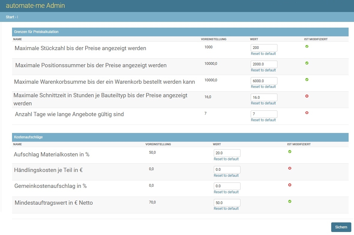 - Materialpreise, Stundensätze, Rüstzeiten und vieles mehr im Backend selbst einstellbar.