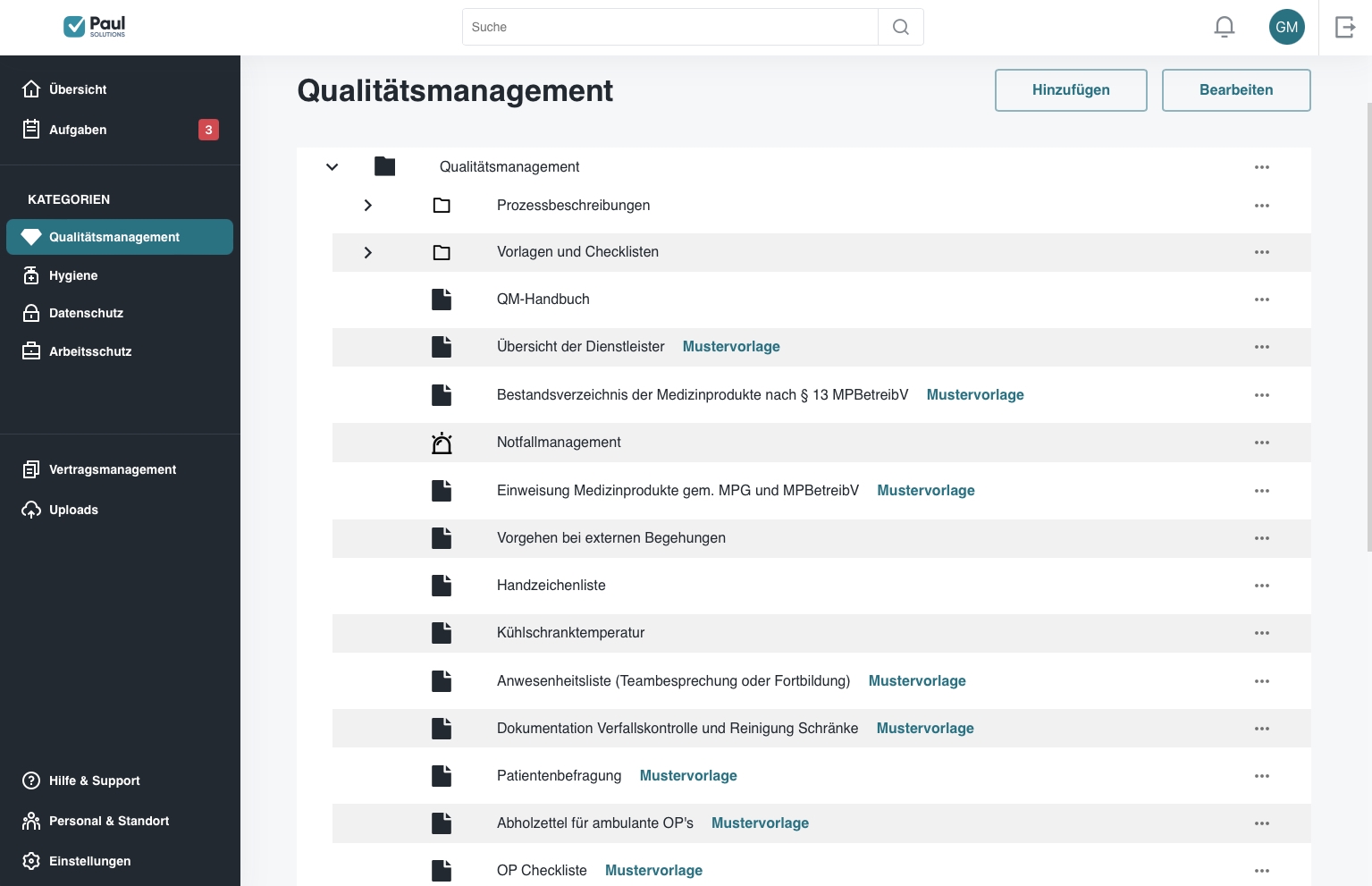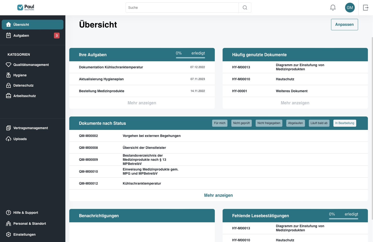 PAUL ist eine integrierte und webbasierte Qualitätsmanagement Lösung für Arztpraxen, Krankenhäuser und Pflegeheime, die patientenfremde Bereiche standardisiert und organisiert. In die Software sind über 10 Jahre Erfahrung im Qualitätsmanagement für Organisationen des Gesundheitswesens eingeflossen.