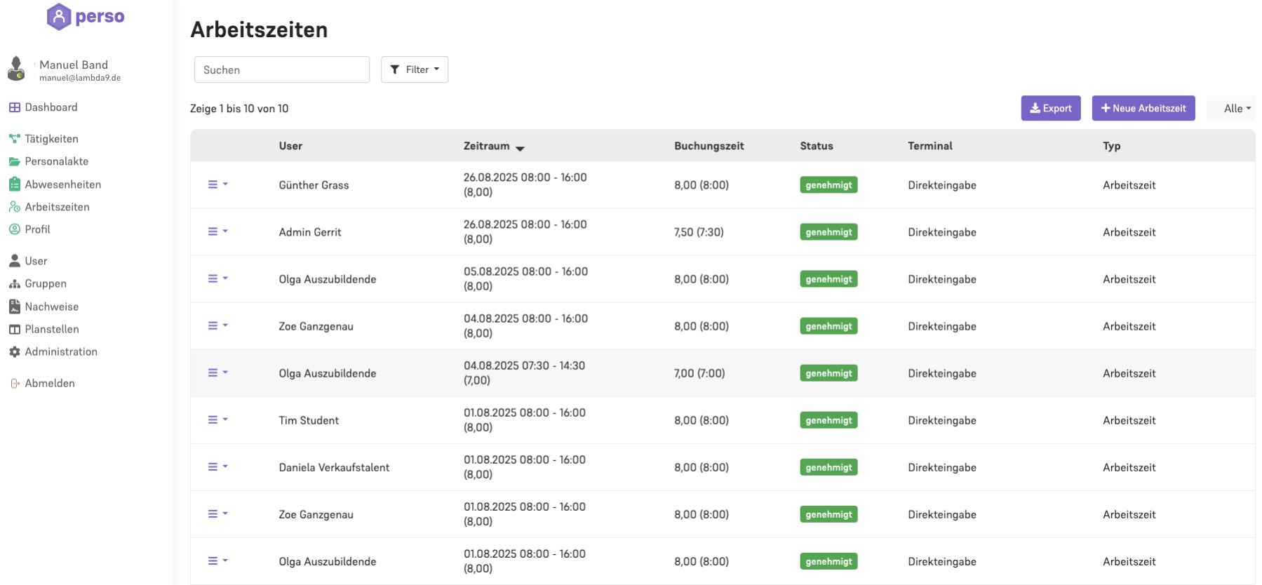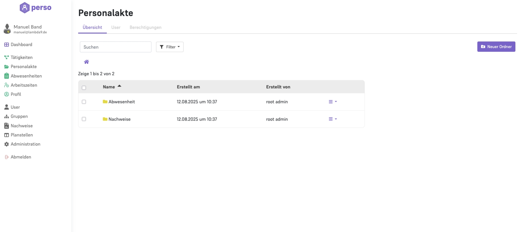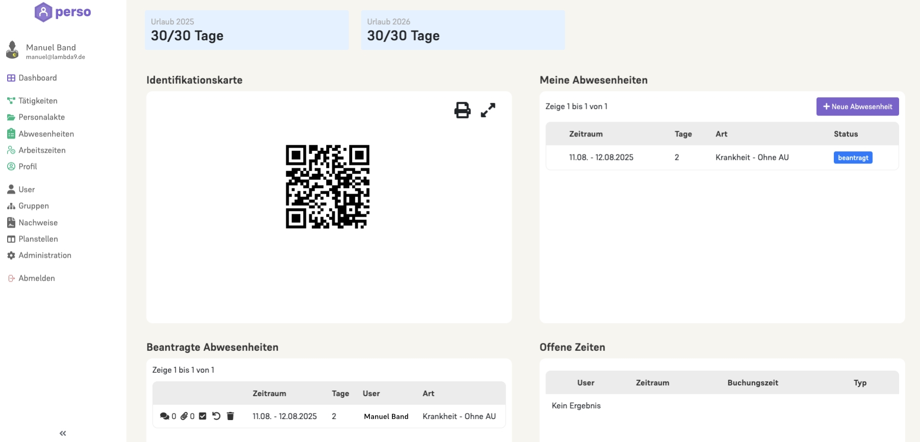 Mit perso bietet die lambda9 GmbH eine moderne und praxisnahe Softwarelösung, die Unternehmen eine effiziente Verwaltung ihrer Personaldaten ermöglicht. Von der Arbeitszeiterfassung über die Abwesenheitsplanung bis hin zur Planstellendokumentation - perso vereint alle zentralen Funktionen der Personalverwaltung in einer digitalen, sicheren und benutzerfreundlichen Plattform. Arbeitgeber erfüllen mit perso nicht nur die gesetzlichen Anforderungen zur Zeiterfassung (EuGH/BAG-Urteile), sondern profitieren zugleich von einer erheblichen Zeit- und Kostenersparnis.