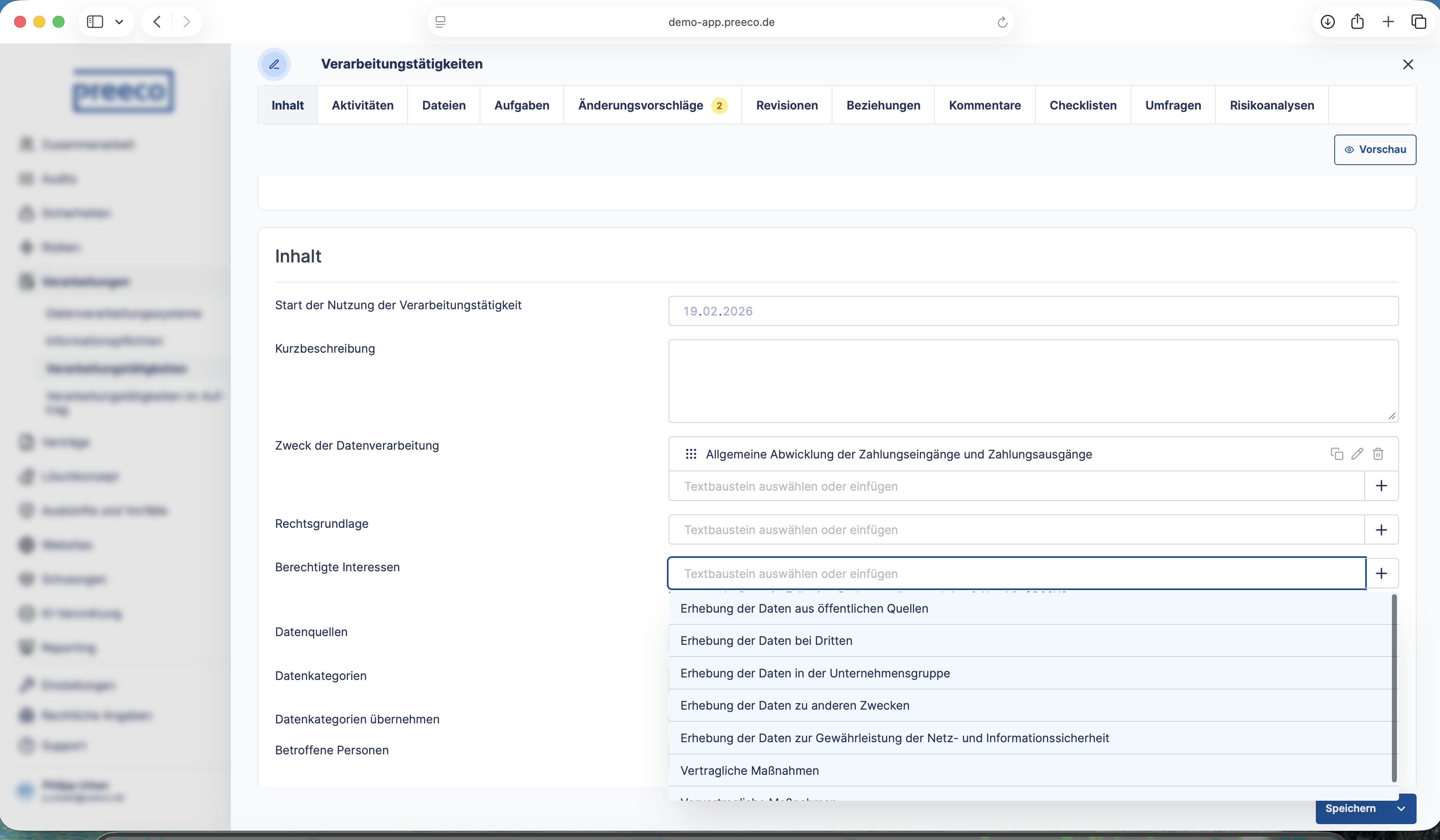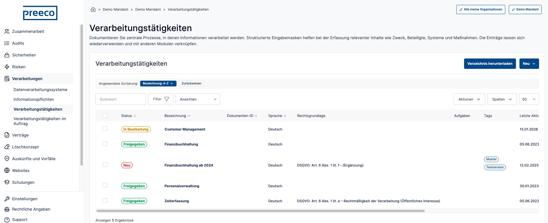 Mit Unterstützung des Datenschutzmanagementsystems preeco | datenschutz konnten die vielfältigen Verarbeitungstätigkeiten nachvollziehbar und strukturiert dokumentiert werden. Die Verknüpfung der zu den Verarbeitungsverzeichnissen gehörenden Einträge unterstützt die Rechenschaftspflicht nachhaltig.
