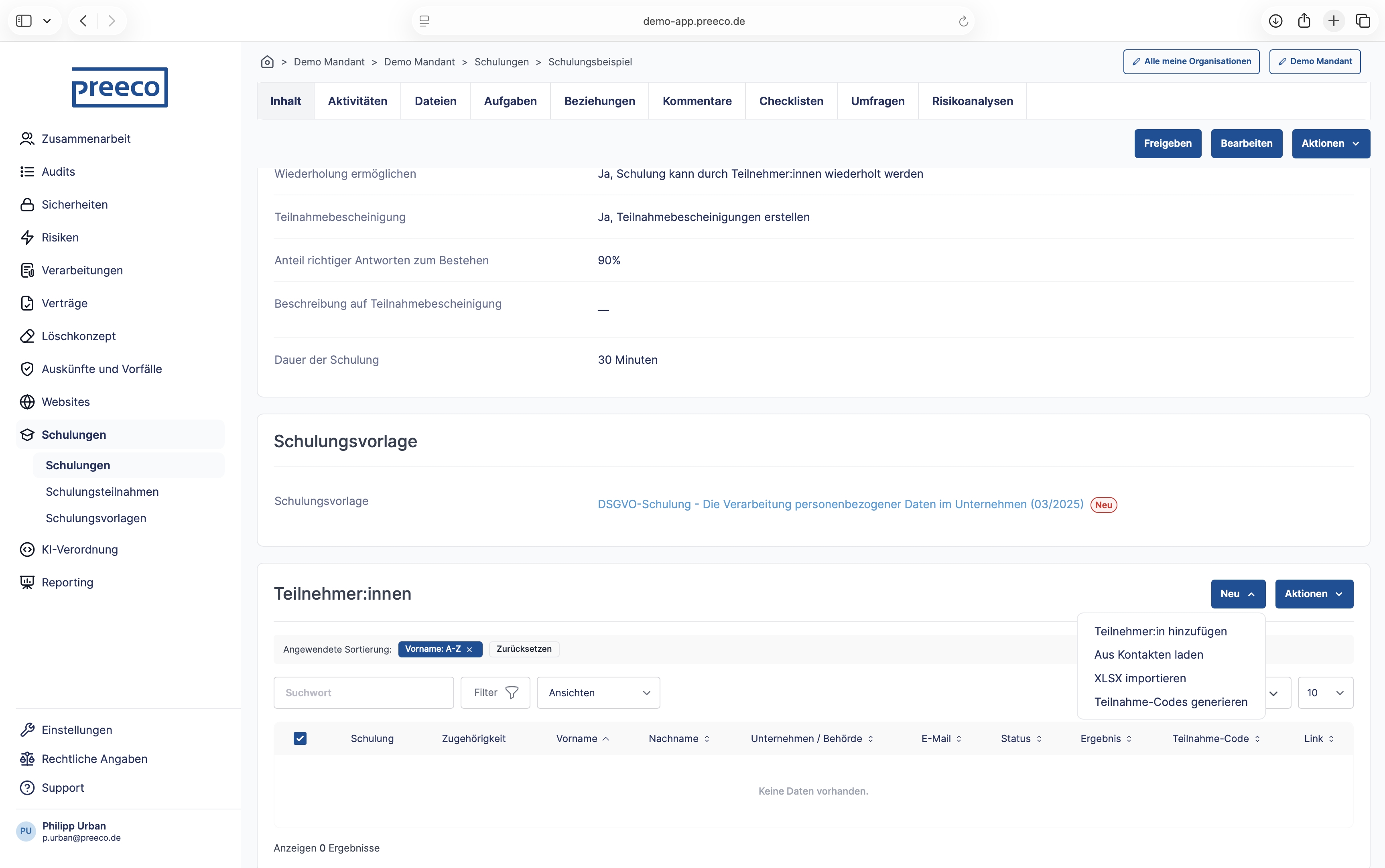 Integrieren Sie Ihr Logo in die Oberfläche und geben Sie es auf Ihren Dokumenten aus. Oder setzen Sie als Reseller preeco | datenschutz als Whitelabel-Lösung ein. Die Anbindung an andere Systeme Ihrer IT-Landschaft und auch die Einbindung in Ihre SSO-Umgebung sind optional möglich.
