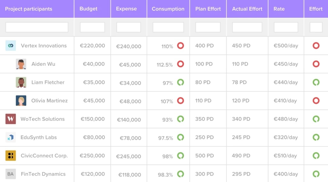 Planen, überwachen und analysieren Sie Budgets, Ressourcen und Ausgaben auf Projekt-, Team- oder Aufgabenebene. Verfolgen Sie Ist- vs. Plan-Kosten in Echtzeit, legen Sie individuelle Kostenkategorien und Stundensätze fest und erkennen Sie Abweichungen sofort.