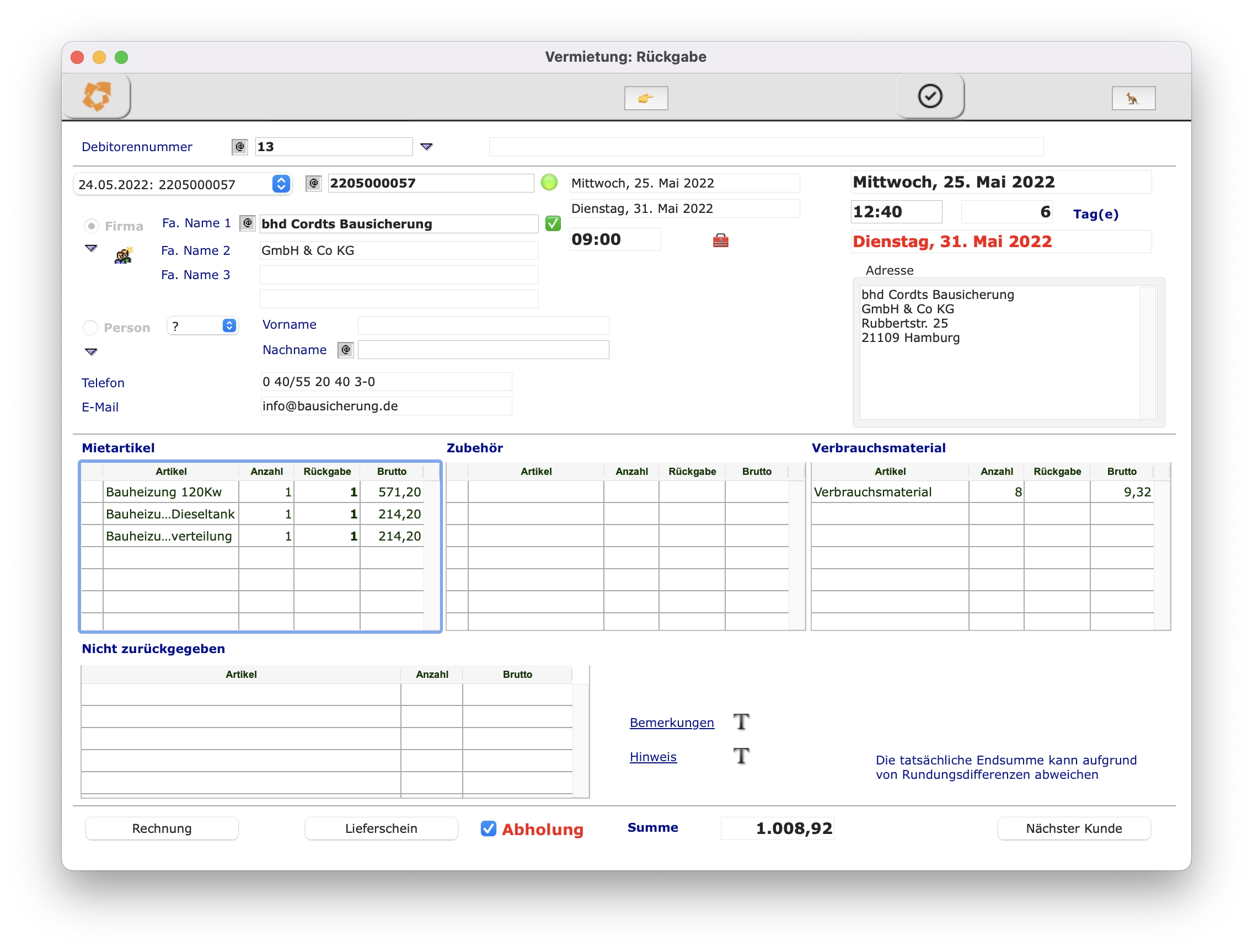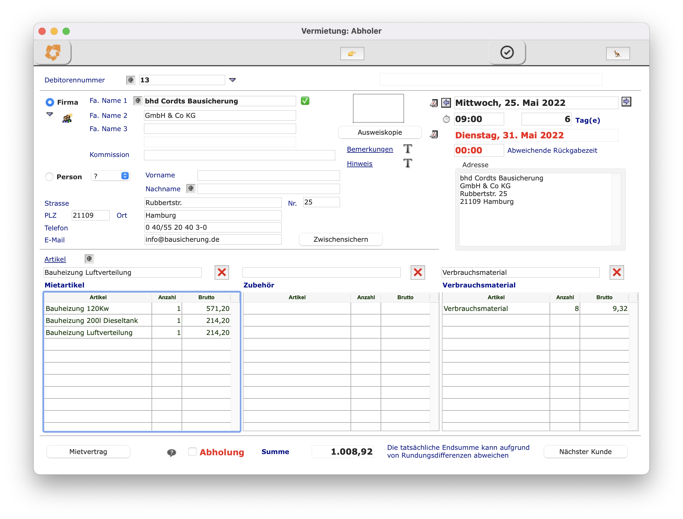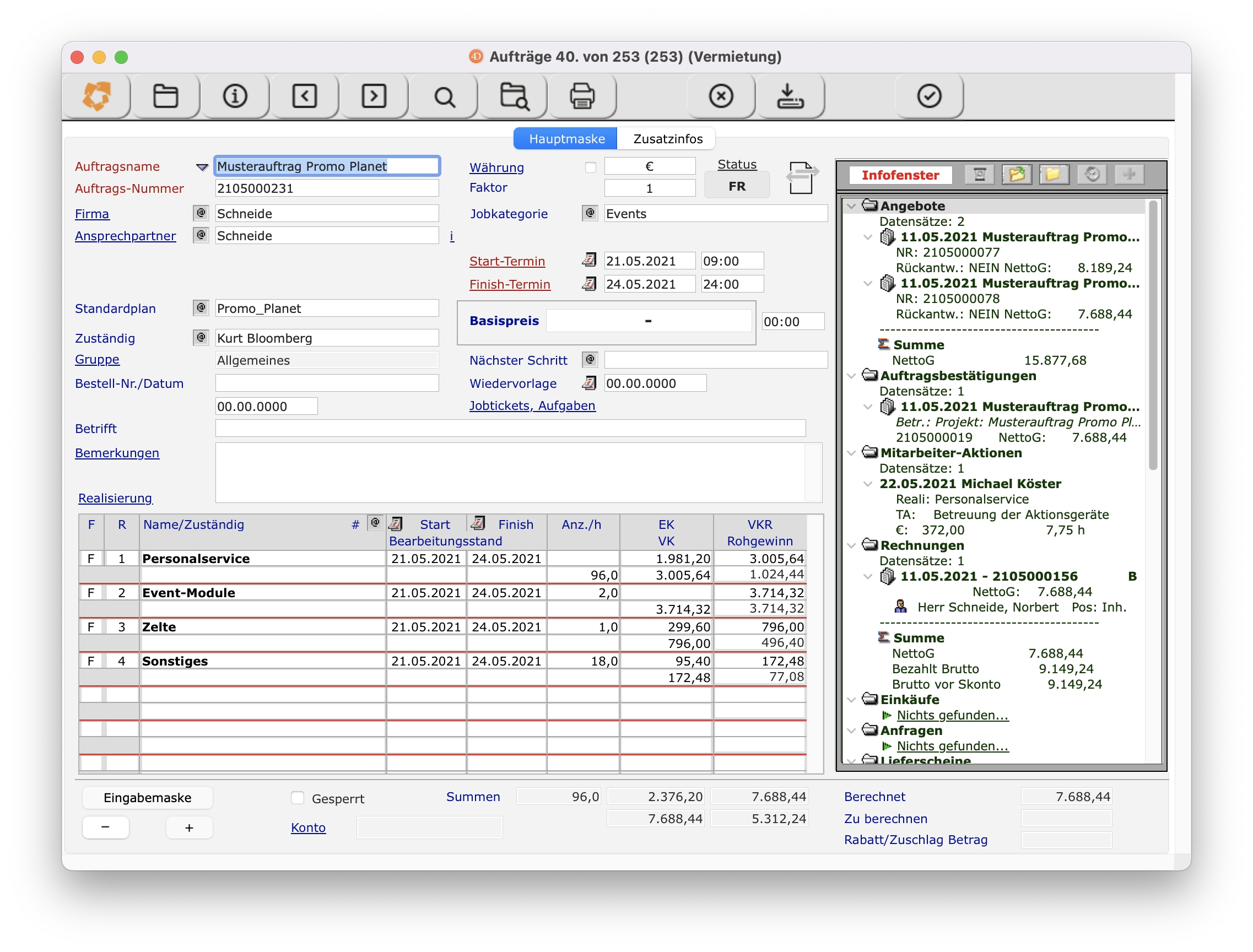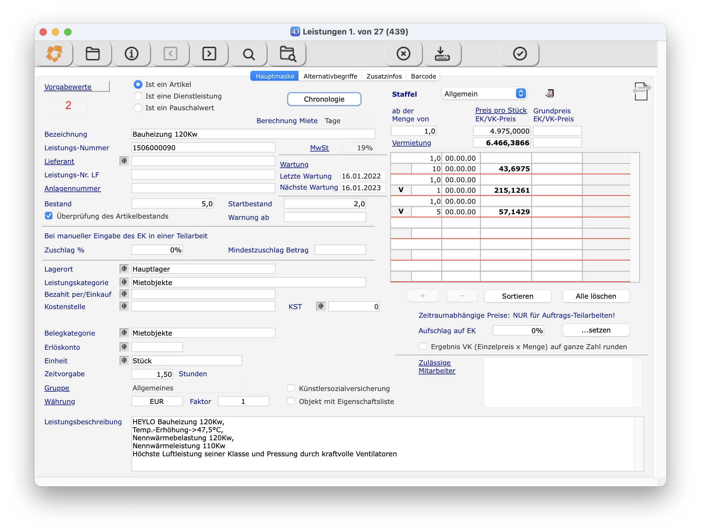 Projekt Manager II sorgt für eine optimale Arbeit durch stets aktuell verfügbare und prozessrelevante Daten auf Knopfdruck. Ihre Artikel- und Leistungsdaten werden mit Ihren individuellen Bezeichnungen und Beschreibungen zentral bereitgestellt. Das intelligente Artikelmanagement erlaubt u. a. beliebig viele Zusatzartikel pro Hauptartikel. Das System verschafft Ihnen in Sekundenschnelle einen Überblick über die Verfügbarkeit Ihrer Mietobjekte inkl. Zusatzartikeln zu einem bestimmten Datum. Hinterlegte Preisstaffeln pro Mietobjekt ermöglichen die schnelle und exakte Ermittlung des Mietpreises. Die kalkulierten Daten fließen in Angebote, Auftragsbestätigungen, Verträge und Rechnungen. PM II ermittelt automatisch die eventuell erforderlichen Rüstzeiten für Ihre Artikel und unterstützt z.B. durch den integrierten Terminkalender, die Planung Ihrer Ressourcen für Lieferung sowie Auf- und Abbau.