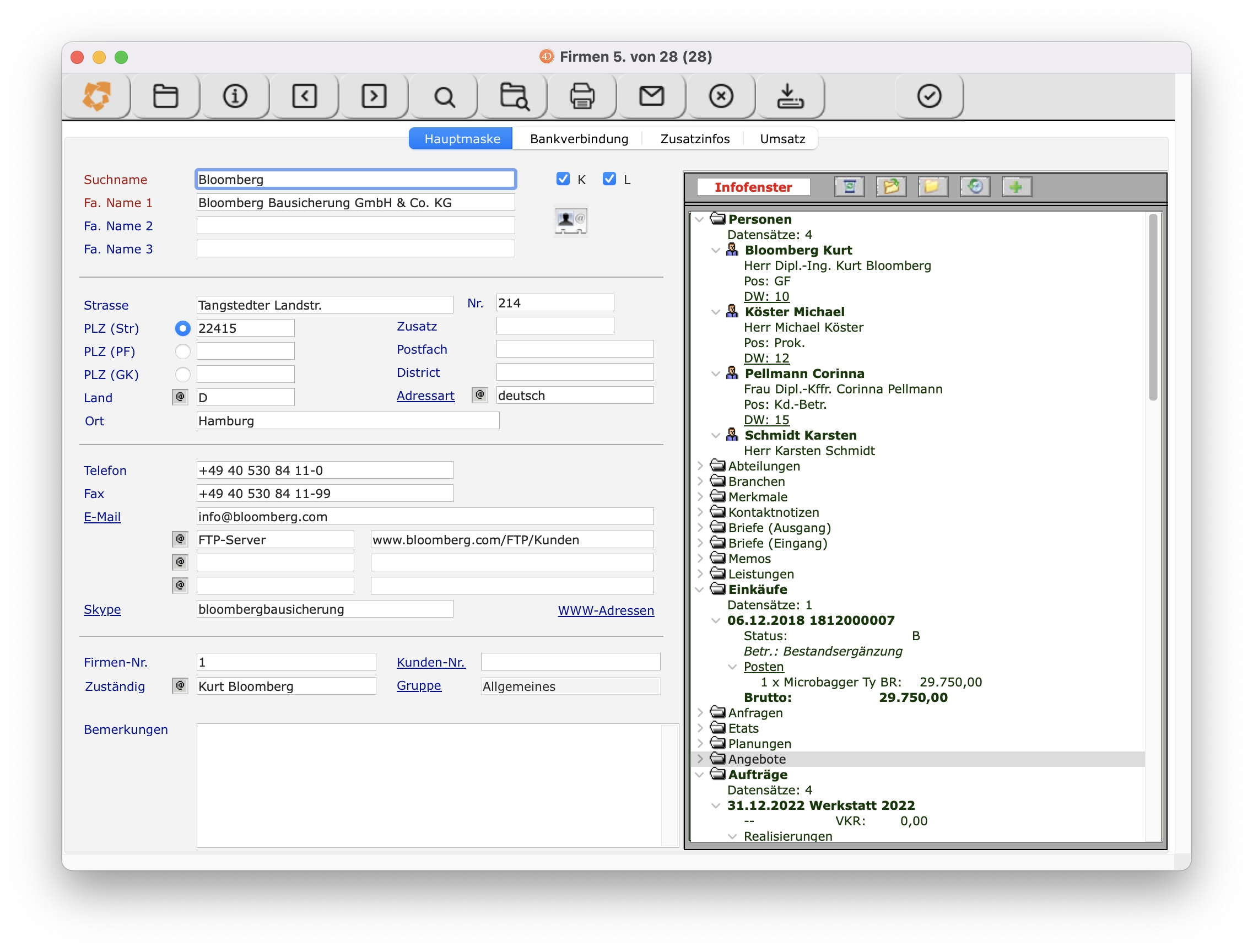 Eine zentrale Adressverwaltung für Kundendaten, Lieferanten- und Mitarbeiterdaten ist essentiell. Über eine Schnittstelle können Sie Daten an andere Applikationen und PDAs im iCalender- und vCard-Format exportieren. Mit nur wenigen Klicks stehen die Notizen, Ansprechpartner etc. zur Verfügung.