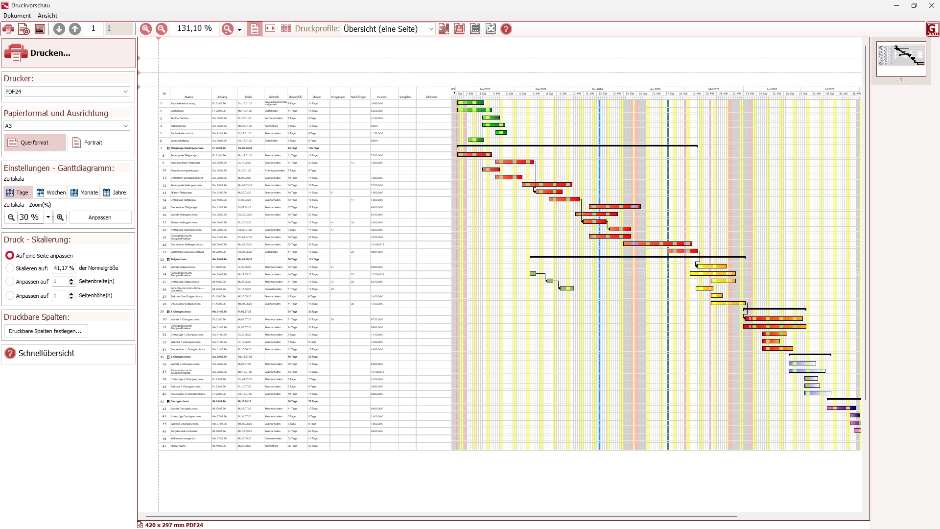 Dazu stellt das Programm Arbeitsabläufe und gegenseitige Abhängigkeiten in Form von Balken-, Struktur- oder Netzplänen übersichtlich dar, optimiert den Ressourceneinsatz und zeigt Engpässe auf. Werden die einzelnen Vorgänge miteinander verknüpft und deren zeitliche Abhängigkeiten definiert, lässt sich schnell und exakt berechnen, welche Folgen die Terminverschiebung eines oder mehrerer Gewerke auf Folgetermine hat.