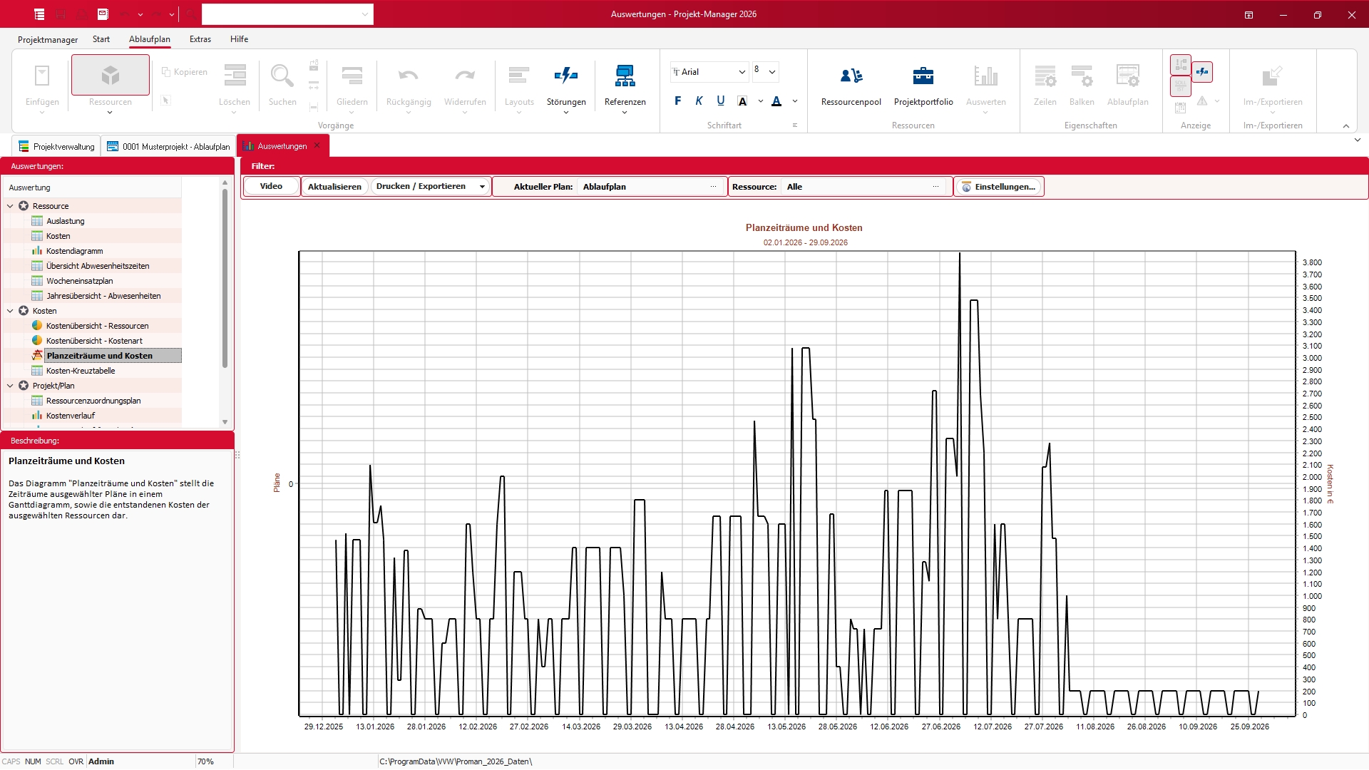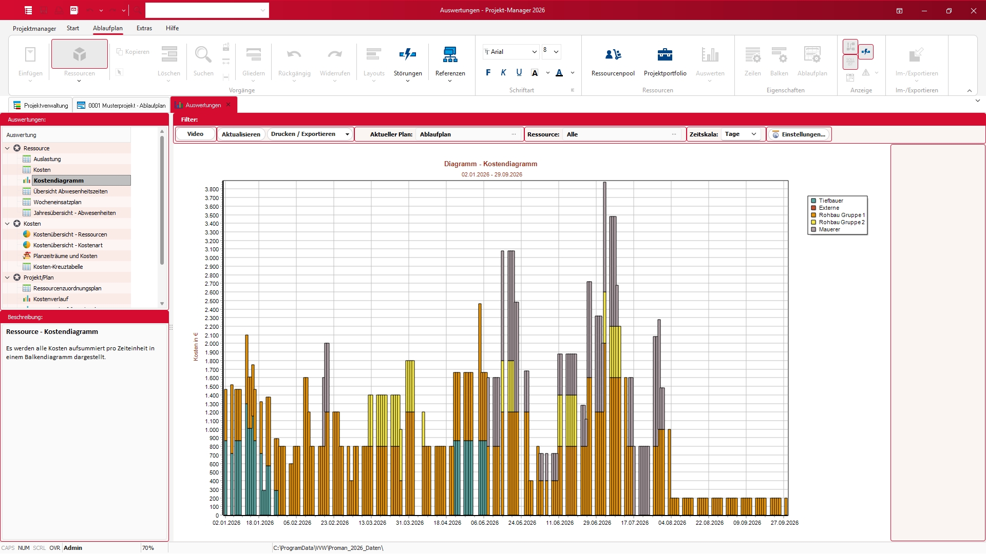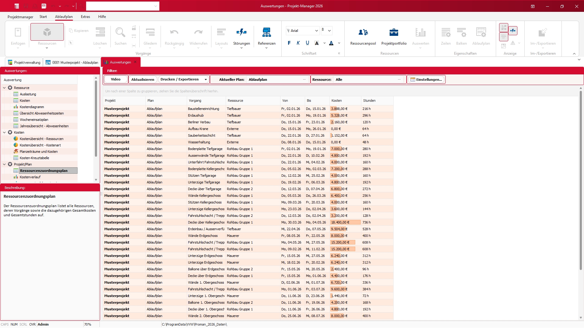 Um die Kosten einer Ressource zu berechnen, kann man entweder auf bestehende Kostendaten zugreifen oder diese neu eingeben. Bei Planungsänderungen verschieben sich alle abhängigen Elemente automatisch mit, so dass die Konsequenzen sofort erkennbar sind. Sollte es dabei zu Konflikten mit anderen Gewerken oder Baustellen kommen, werden diese angezeigt. Dank umfangreicher Auswertungsmöglichkeiten und Reports haben Projektverantwortliche alle Personal- und sonstigen Unternehmensressourcen stets im Blick. Ausgewertet werden Ressourcen, deren Auslastung und Kosten sowie Abwesenheitszeiten in Form von Diagrammen, Wocheneinsatzplänen und Jahresübersichten, Kostenübersichten und Kostenverläufen, Meilensteinlisten oder Soll/Ist-Vergleichen.