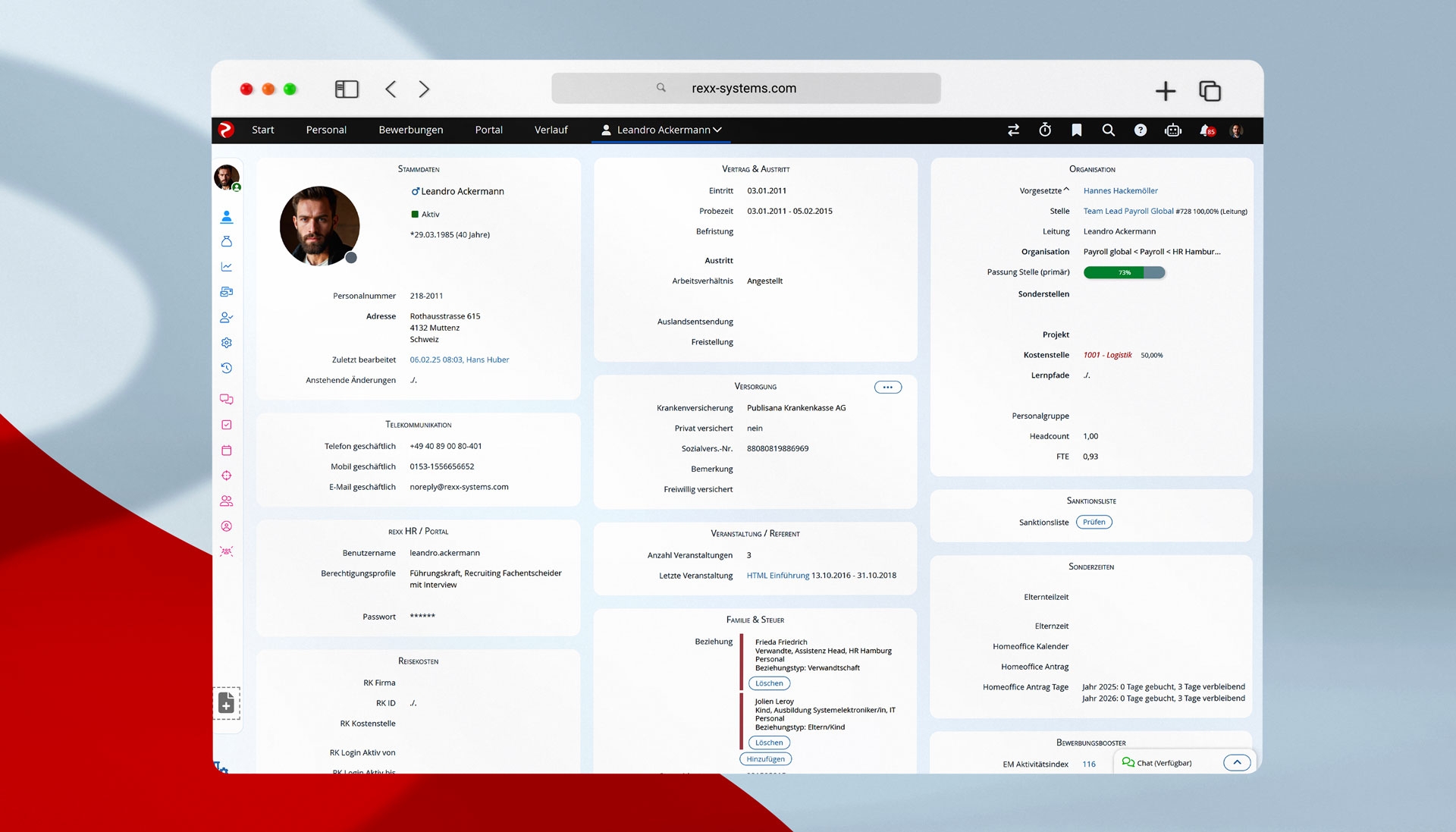 Mit Rexx HR gestalten Sie Personalmanagement effizient, transparent und digital. Schluss mit Papierakten, Excel-Listen und doppelter Datenerfassung - alle Informationen rund um Ihre Mitarbeitenden werden zentral in der digitalen Personalakte gebündelt. Ob Stammdaten, Dokumente, Zeugnisse oder Zertifikate: Sie haben alles im Blick - jederzeit und standortübergreifend.