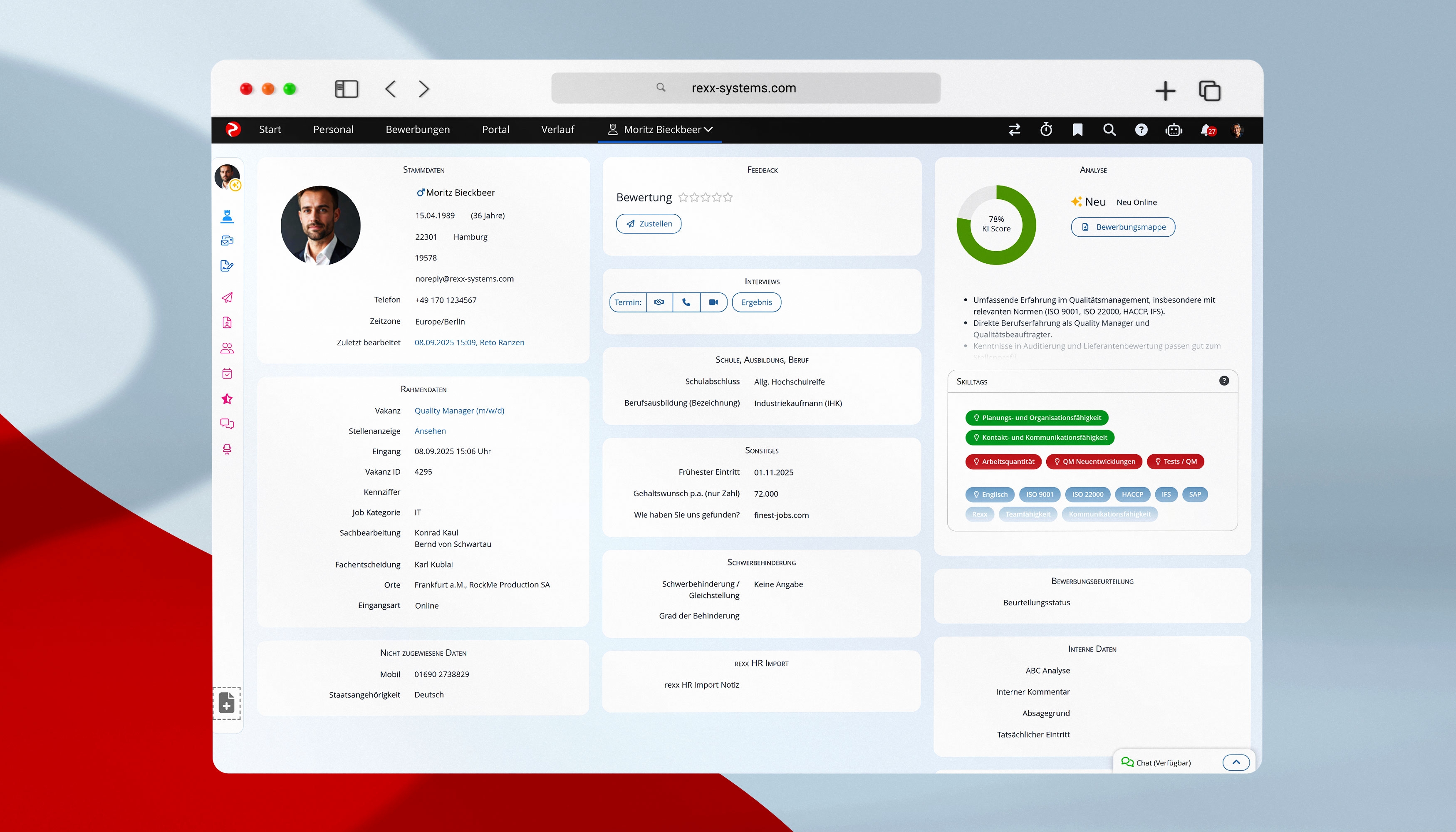 Rexx Recruiting ist die intelligente All-in-One-Lösung für modernes E-Recruiting. Die Software digitalisiert und automatisiert den gesamten Bewerbungsprozess - von der Stellenausschreibung bis zum Onboarding. Dank KI-gestützter Funktionen wie AI Hiring und der Vakanz Analyse optimieren Sie Ihre Recruiting-Performance nachhaltig: Bewerbende werden automatisch mit den Anforderungsprofilen abgeglichen, und der KI-Score zeigt auf einen Blick die Passgenauigkeit inklusive Begründung.