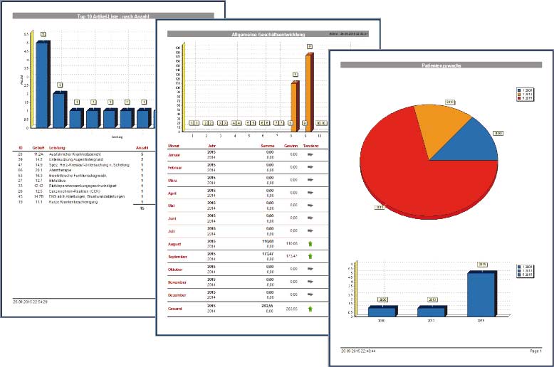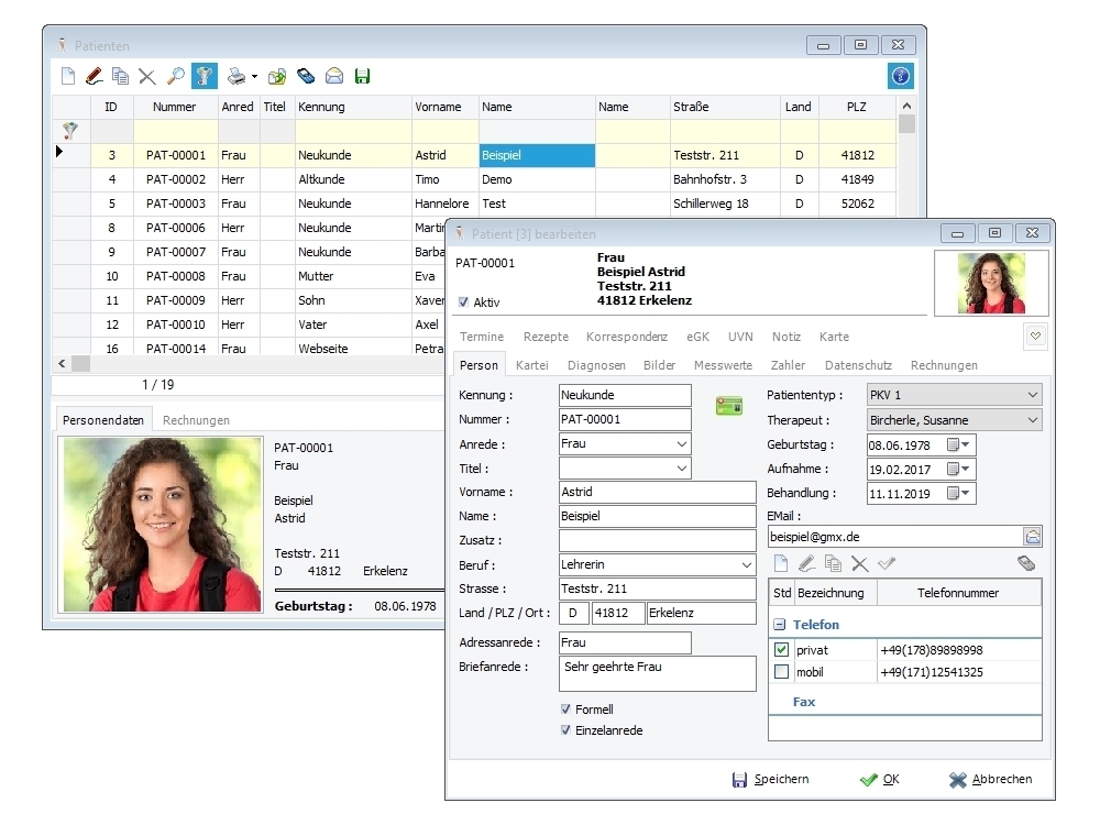 Es ist eine sehr komfortable Patientenverwaltung vorhanden, die auch eine Bildverwaltung enthält, z. B. für die Speicherung Bildgebender Diagnostik, es können auch direkt aus dem Programm heraus Bilder eingescannt werden. Auch können hierüber Briefe und Serienbriefe an die Patienten geschrieben und verwaltet werden. Ebenso Diagnose- und Karteieinträge und Notizen. Eine Geburtstagsliste ist ebenso vorhanden, damit der Patient zum Geburtstag angeschrieben werden kann.