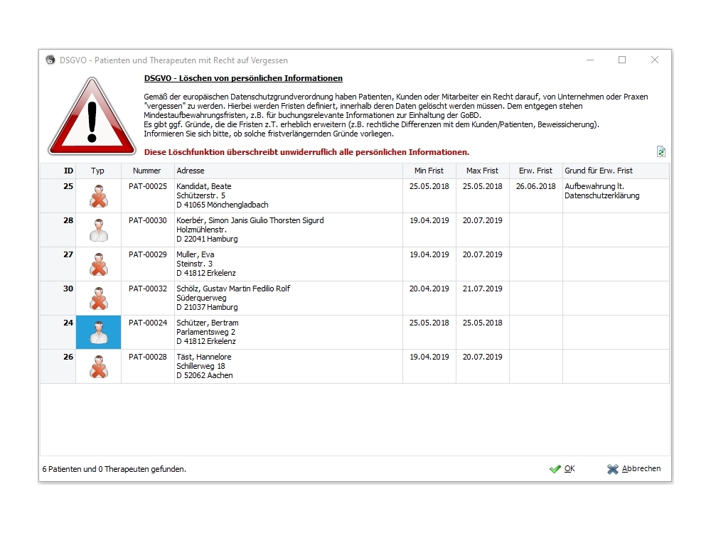 Die erweiterte Aufbewahrungsfrist dient einer individuellen Eingabe, falls dieser Patient aus irgendeinem Grund länger aufbewahrt werden muss, diese Begründung kann natürlich hierzu eingegeben werden. Bis zum angegebenen Datum erscheint dieser Patient nicht in der Vorschlagsliste zur Löschung. Mit diesem Reiter war es uns möglich die Händelbarkeit der DSGVO deutlich zu steigern. Ein Video, das diese Dinge weiter veranschaulicht, auch z. B. das Einscannen der entsprechenden Verträge haben wir im Bereich Tutorials hinterlegt.