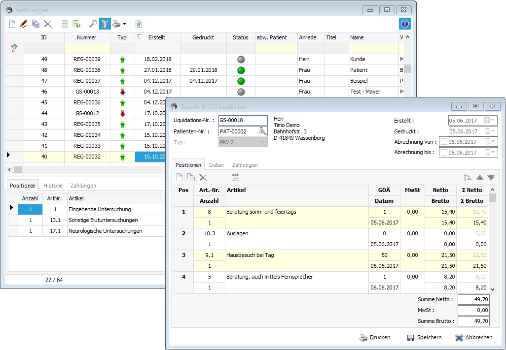 Rechnungen und Mahnungen sind aus unserer Sicht einer der Hauptbestandteile des Programms. Hier kann aus der vorgegebenen GebüH die Leistung direkt in die Rechnung übernommen werden, verschiedene Preisstufen angelegt werden, aber es können auch eigenen Leistungen und Artikel angelegt und verwaltet werden. Auch ist es möglich Sammelleistungen zu erstellen, die bestimmte Leistungen zusammenfassen, die somit schneller in die Rechnung übernommen werden können. Selbst die Abrechnung mehrwertsteuerpflichtiger Artikel ist möglich, auch Fremdwährungen können abgerechnet werden. Ebenso verfügt das Programm über einen automatisierten Mahnlauf. Rechnungen und Mahnungen können, wie alle anderen druckbaren Formulare selbst gestaltet werden. Eigene Formulare und Dokumente können erstellt und die Datenbankinformationen hierin eingebunden werden.