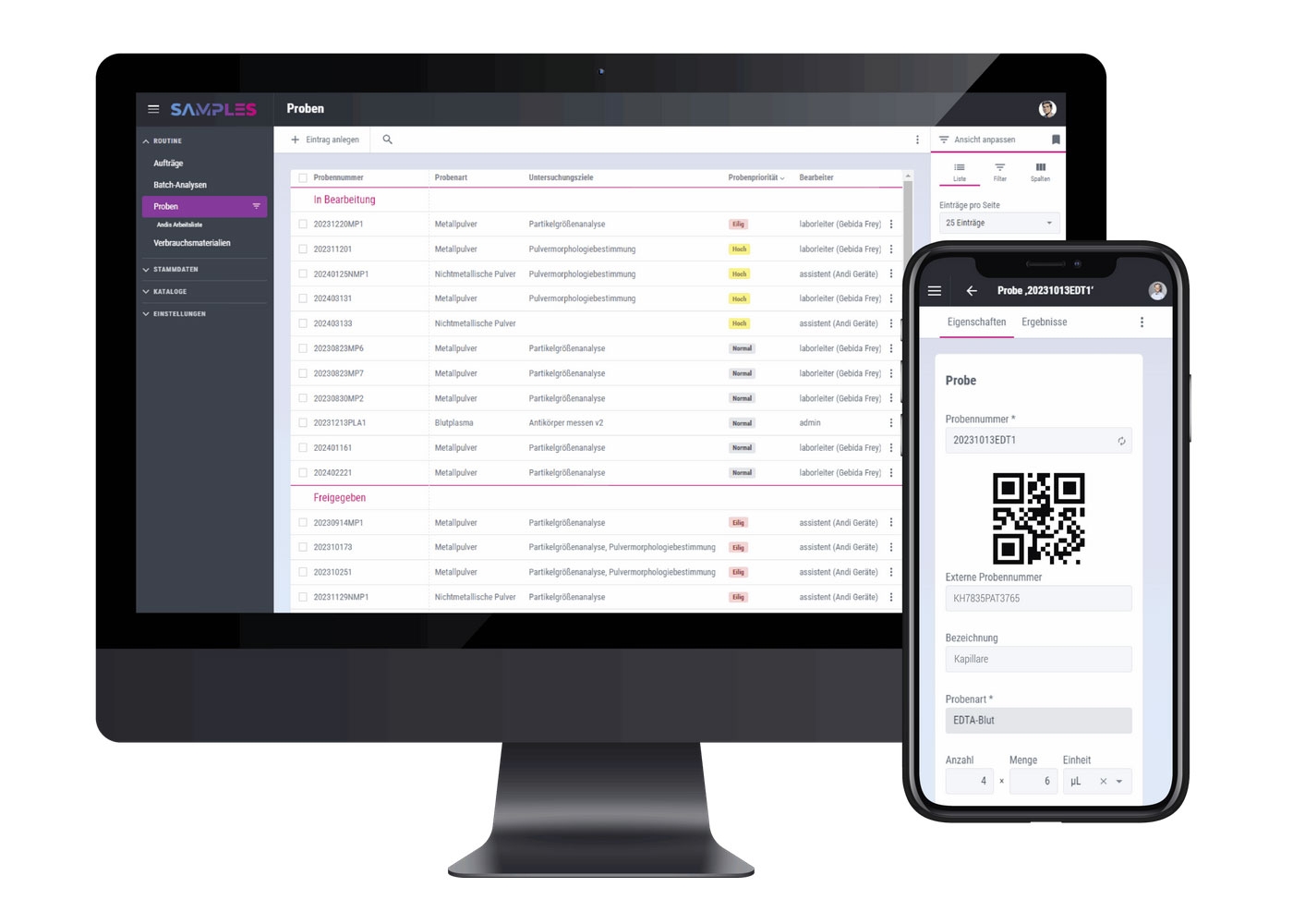 Für die praktische Nutzung im Labor bietet SAMPLES eine moderne, intuitiv bedienbare Oberfläche mit personalisierbaren Ansichten. Sie arbeiten nicht nur am Desktop, sondern auch mobil im Webbrowser auf Tablet oder Smartphone. So bleiben Sie maximal flexibel - bis hin zur Probennahme im Feld dank verfügbarer Outdoor-Funktionalitäten wie GPS-Daten, Offline-Modus und optimierter Benutzeroberflächen.
