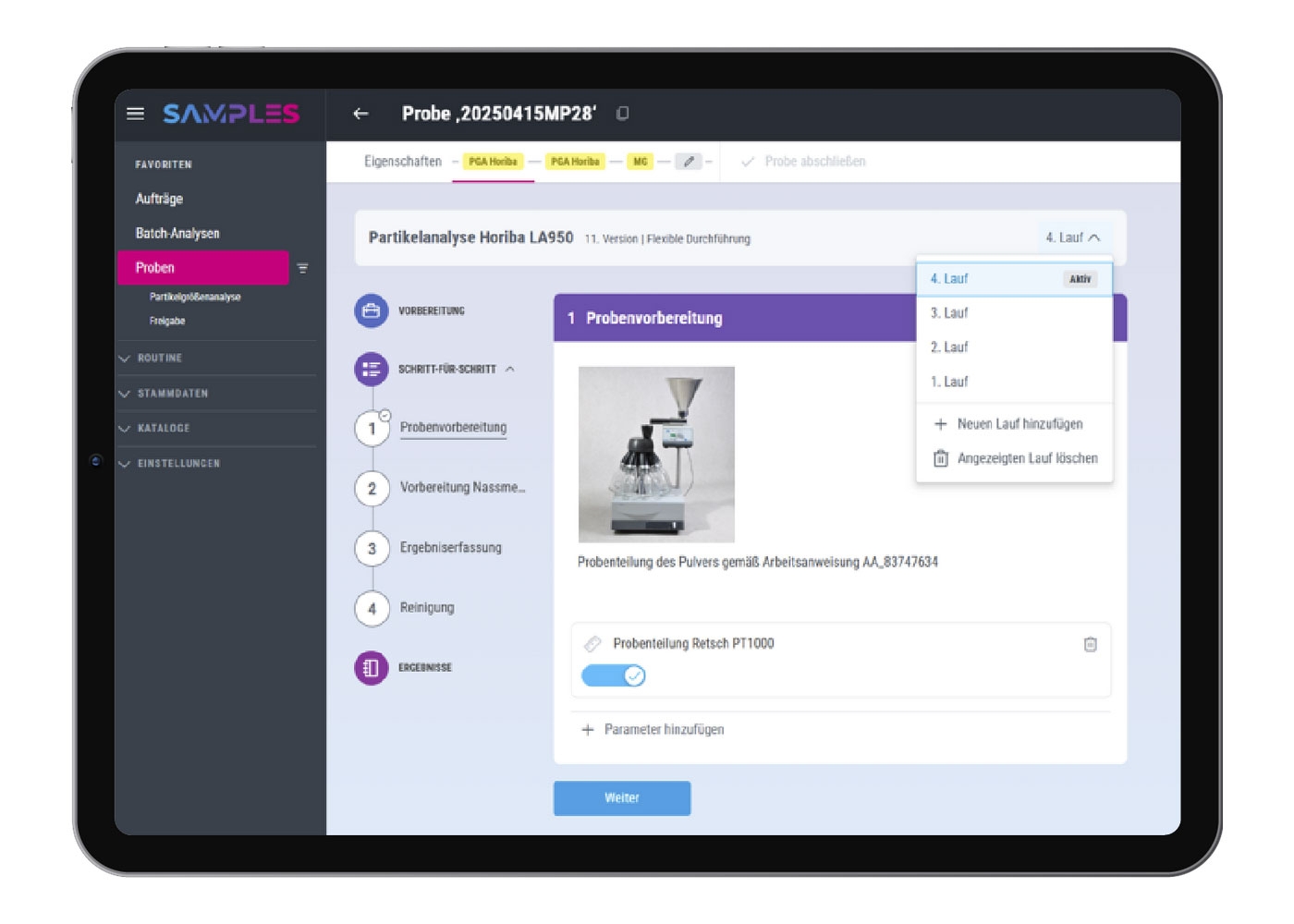 SAMPLES ist so konzipiert, dass Sie Ihre Laborprozesse nicht nur dokumentieren, sondern aktiv digital ausführen und standardisieren. Das integrierte LES unterstützt dabei mit interaktiven Schritt-für-Schritt-Anleitungen und sorgt für reproduzierbare Abläufe im Arbeitsalltag. Gleichzeitig profitieren Sie von einer flexiblen Konfigurierbarkeit, sodass Ihre individuellen Workflows abgebildet werden können und die Anwendung bei neuen Anforderungen problemlos mitwächst.