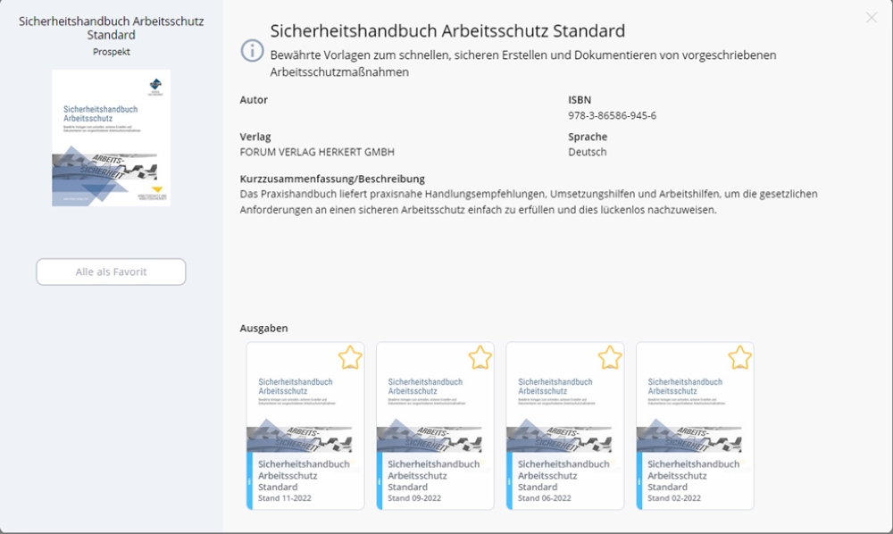 Mit dem "Sicherheitshandbuch Arbeitsschutz" haben Verantwortliche für den Arbeitsschutz alle wichtigen Informationen aktuell zur Hand. Sie können schnell die notwendigen Arbeitsschutzmaßnahmen ergreifen und die gesetzlichen Vorgaben erfüllen. Die Medienbibliothek und das begleitende Handbuch umfasst hierfür zahlreiche Hilfestellungen, Leitfäden und Vorlagen. Hierzu gehören zum Beispiel 900 sofort einsetzbare Dokumente. Sie haben alle notwendigen Informationen und Dokumentationsnachweise zur Umsetzung der Arbeitsschutzmaßnahmen aktuell vorliegen.
